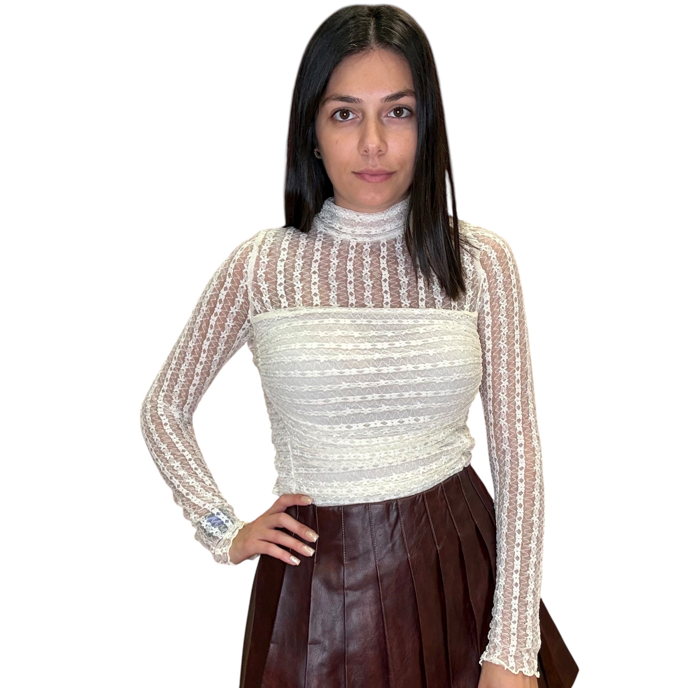 Delicate lace meets a sleek, fitted silhouette in this ruched bodysuit. Featuring a high mock neck, long sleeves, and a body-contouring fit, it’s romantic yet sultry. Perfect for layering or making a statement all on its own.