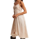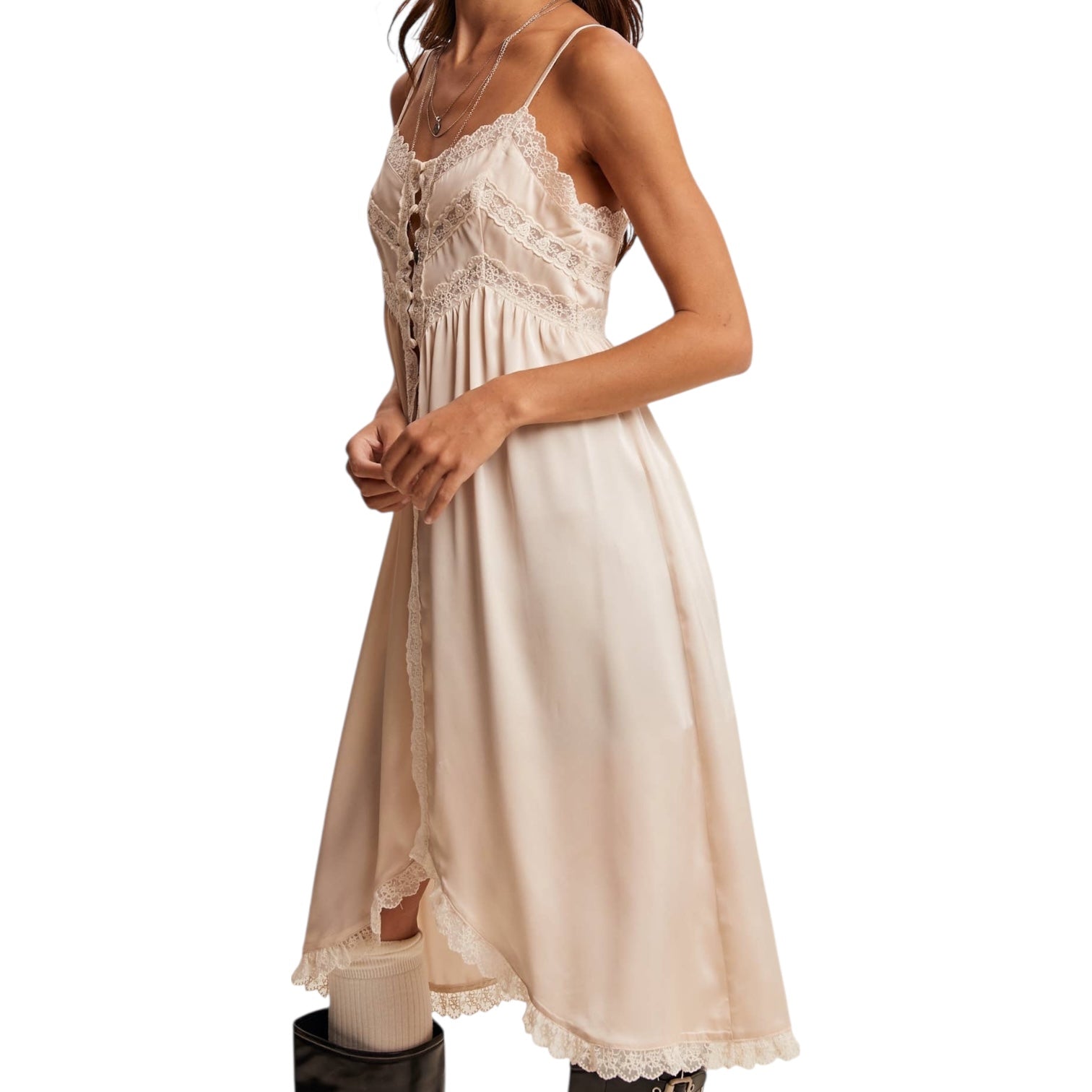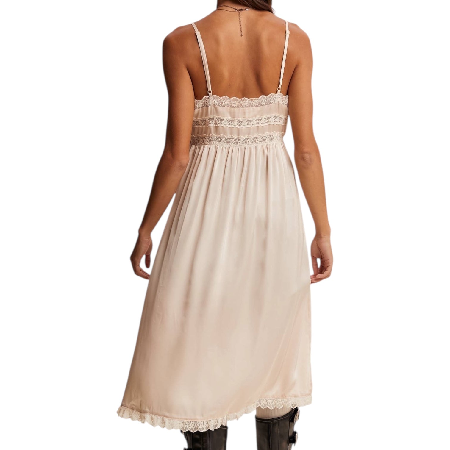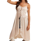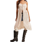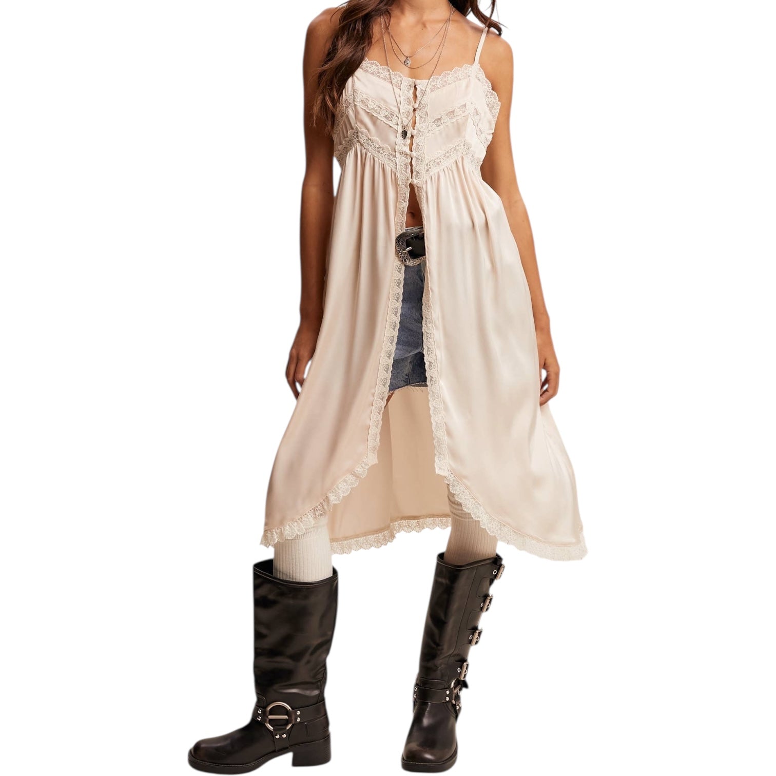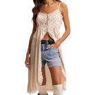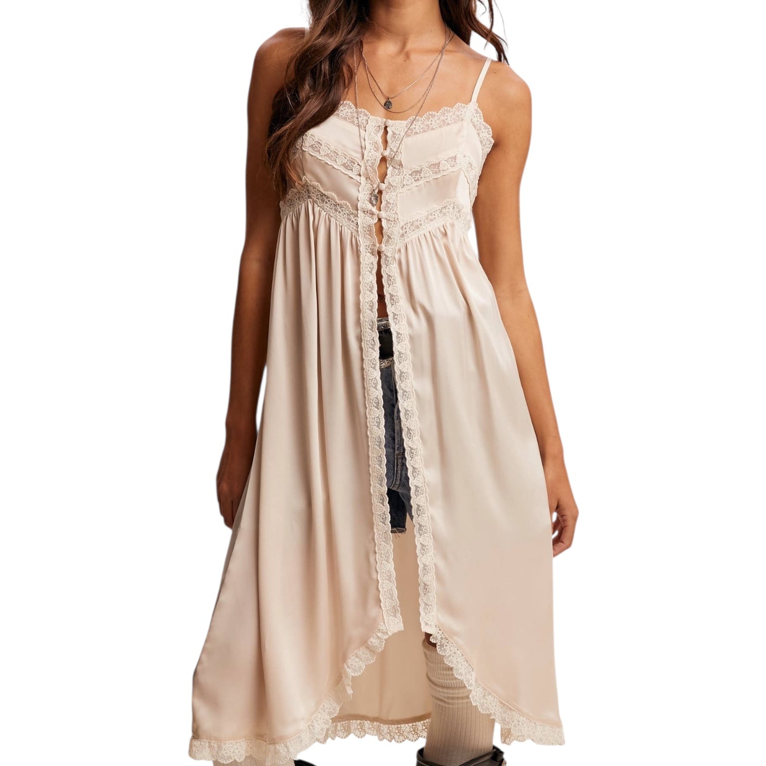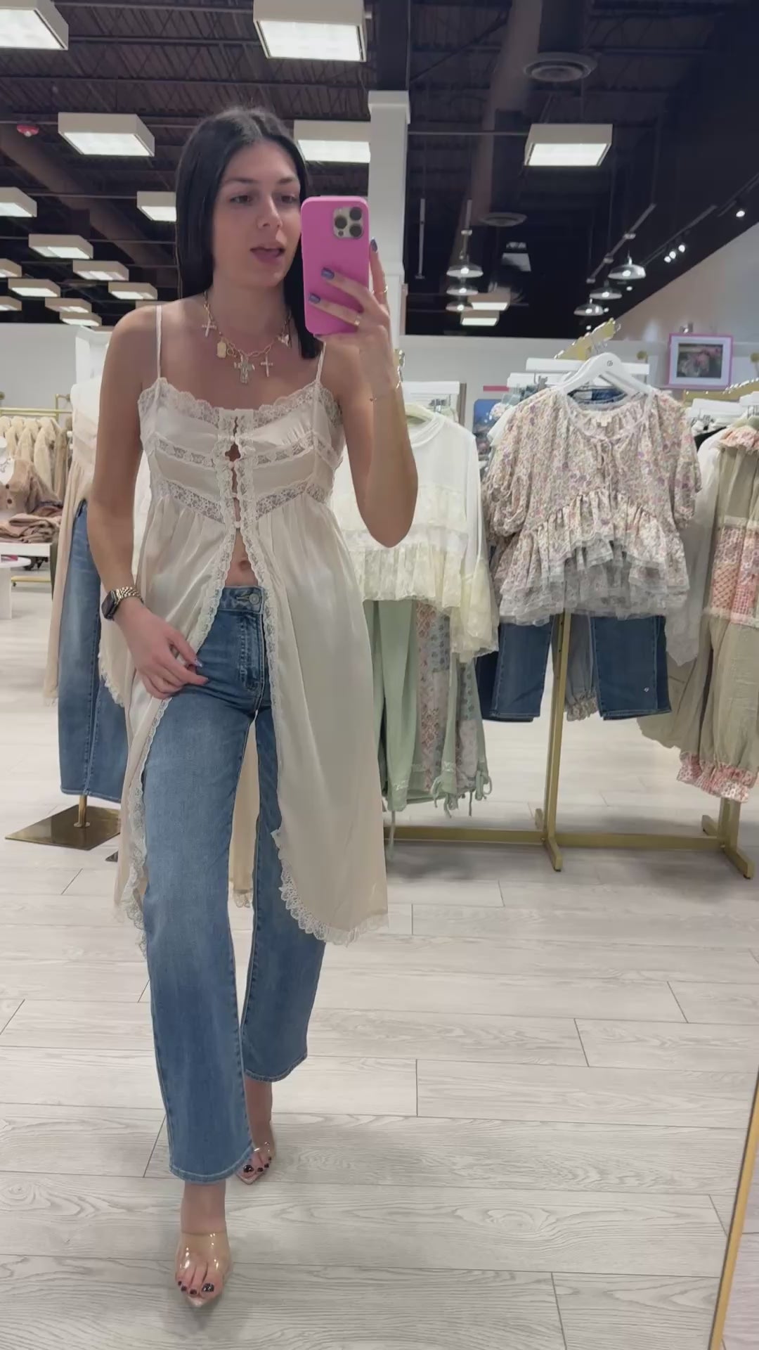 Floaty, feminine, and a little flirty — the Golden Hour Lace Maxi Top brings a soft vintage touch to your fall lineup. Crafted in a silky woven fabric with a luxe sheen, it drapes effortlessly with a romantic button-down front and adjustable spaghetti straps. The delicate lace trim along the neckline and hem adds that dreamy boho charm, while the high-low silhouette moves with you. Perfect for layering — wear it with denim shorts, cowboy boots, or jeans for that free-spirited Western-chic vibe.