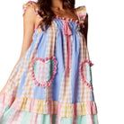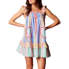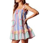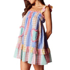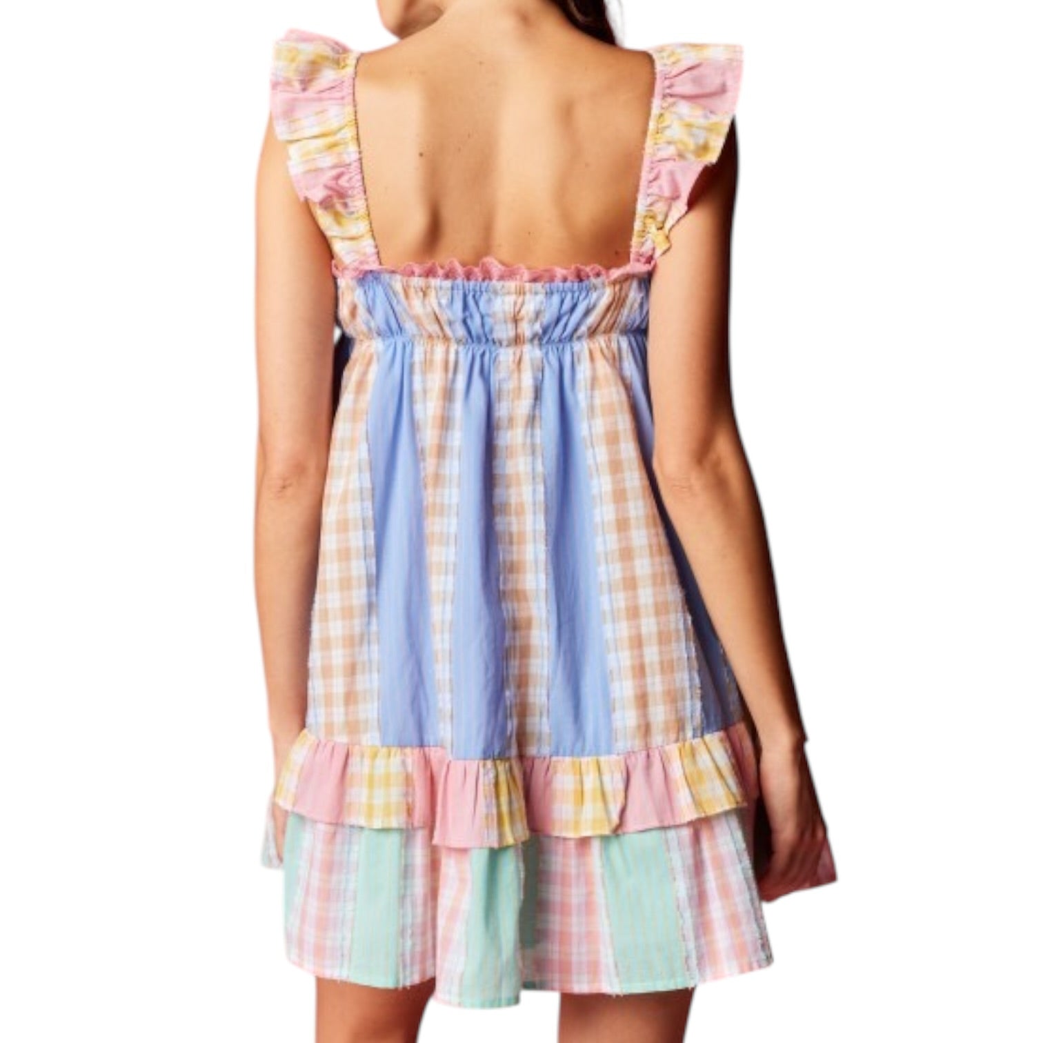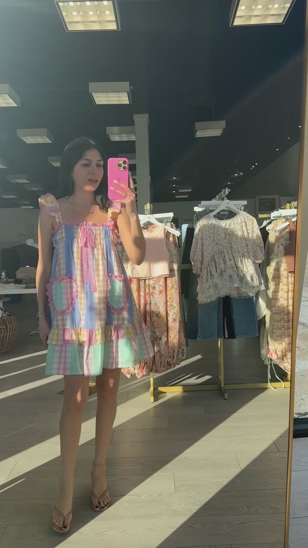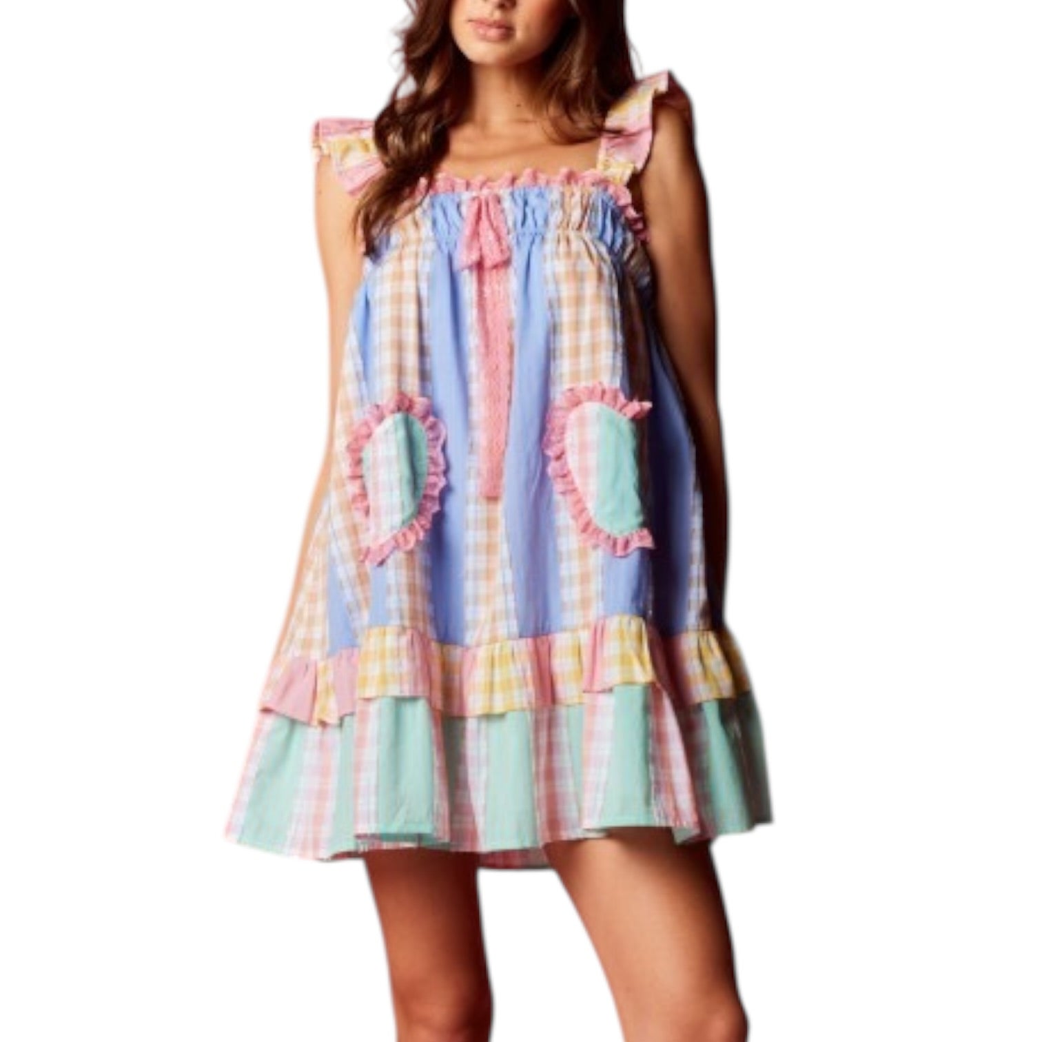 Sweet, colorful, and made to twirl 💕 This pastel patchwork mini dress features a dreamy mix of checks and stripes in soft pink, blue, yellow, and mint tones. Designed with a flattering square neckline, ruffled shoulder straps, and a tiered silhouette that moves beautifully with you. Feminine details like the delicate ribbon tie and ruffle-trimmed pockets give it that extra something special—perfect for spring days, brunch dates, baby showers, and sunny strolls.