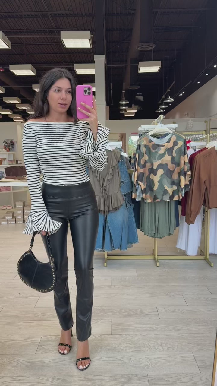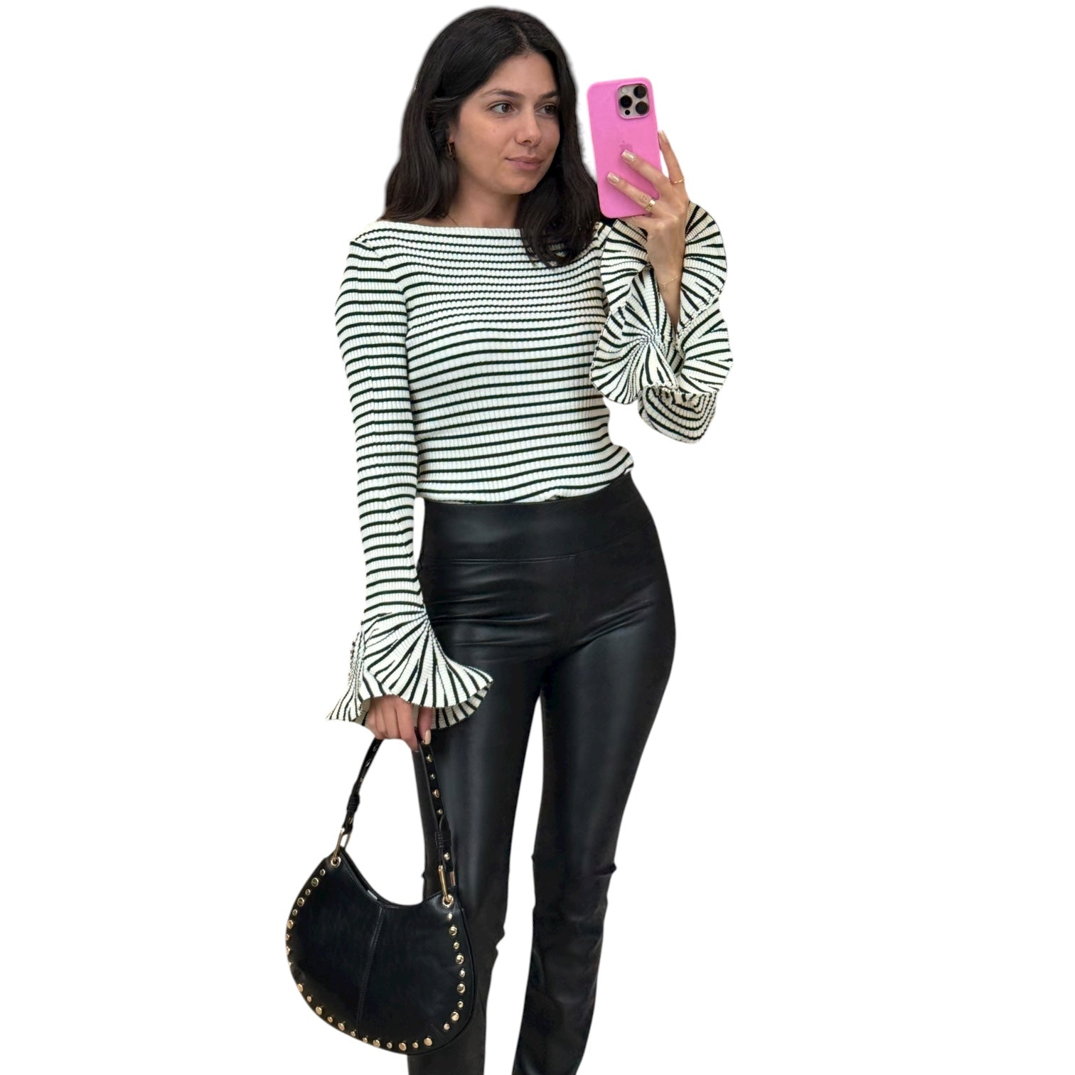 This striped knit sweater brings all the drama with statement flared sleeves and a chic boat neckline. Designed in a ribbed texture with a tailored fit, it’s giving French girl energy with a modern twist.