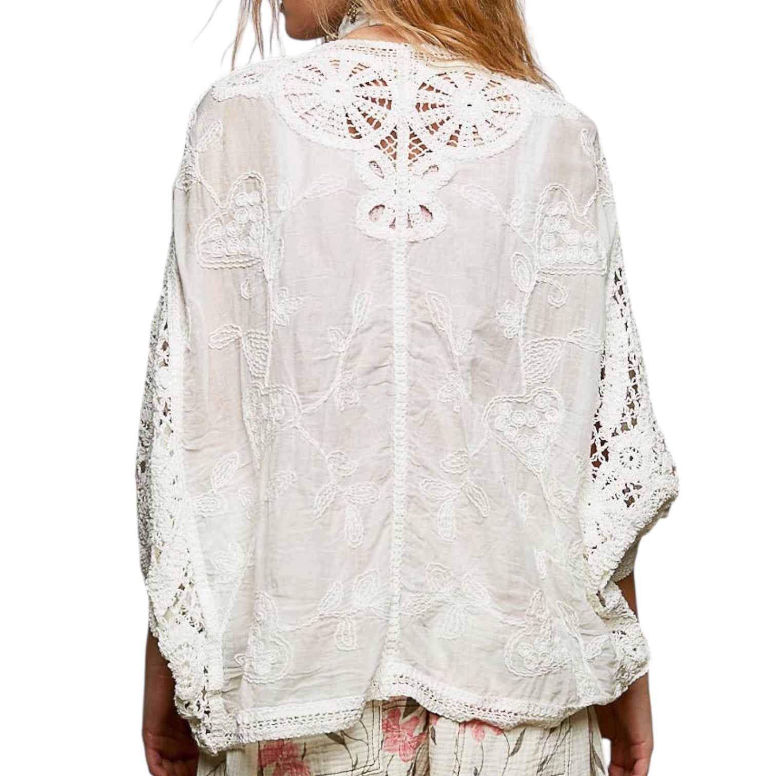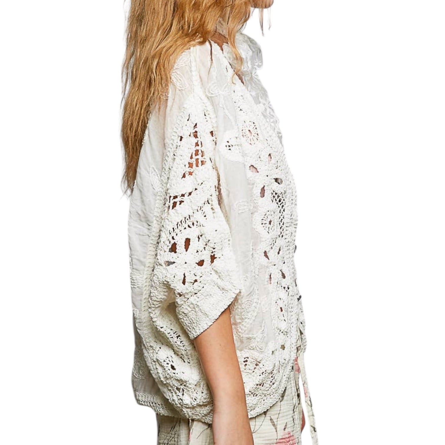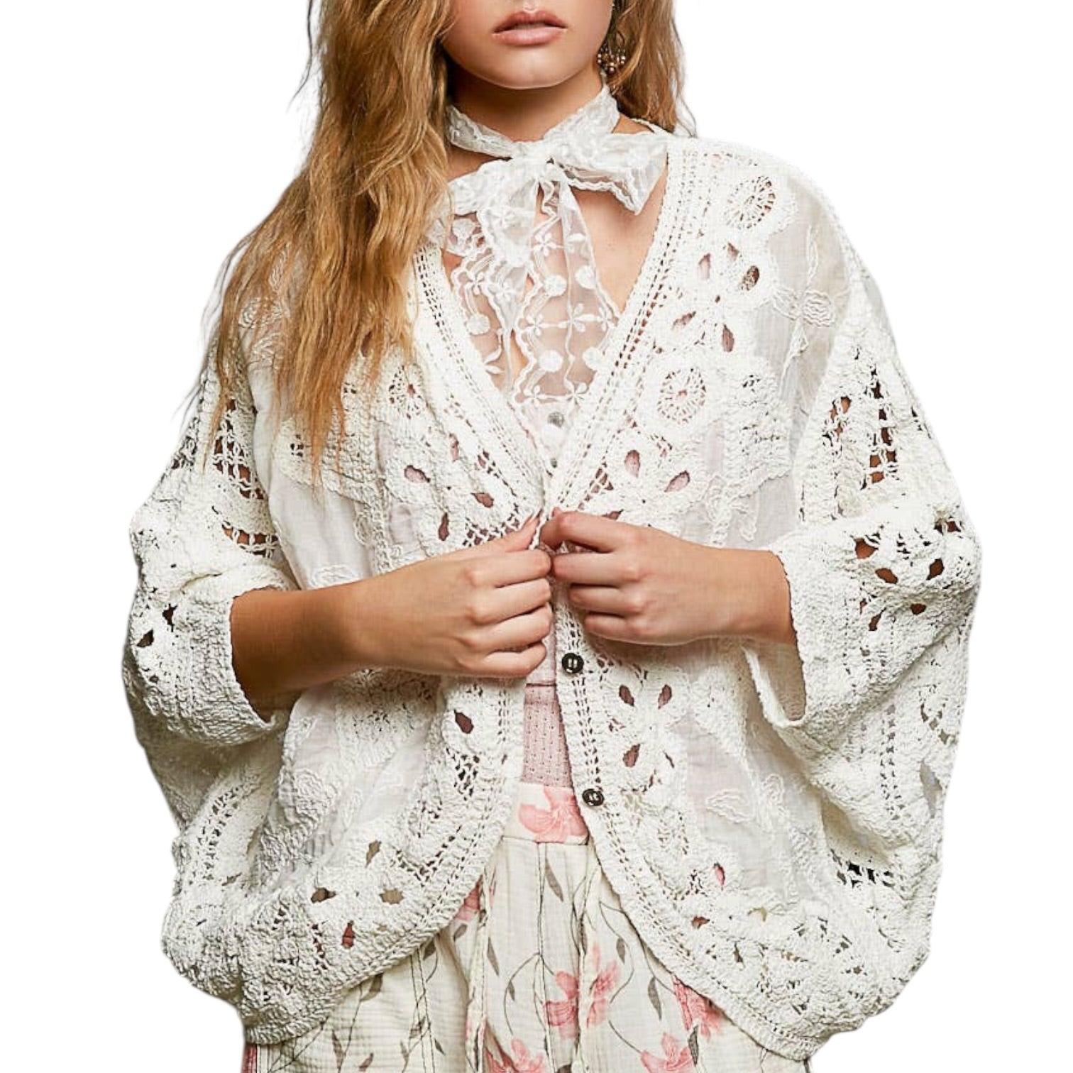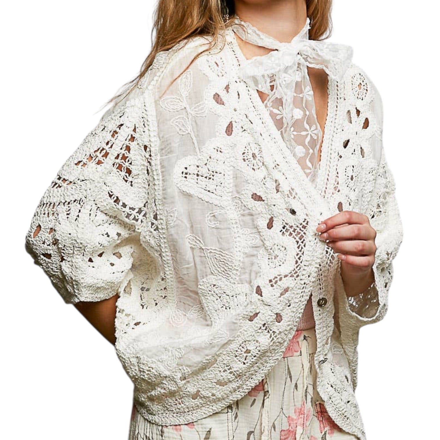 Soft, airy, and made for layering. This crochet cardigan features a relaxed batwing sleeve, flattering V-neckline, and button-down front with a high-low hem for easy movement. The solid off-white shade keeps it timeless while the open crochet texture adds just enough interest. Roomy, breathable, and effortless from season to season ☁️🤍