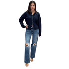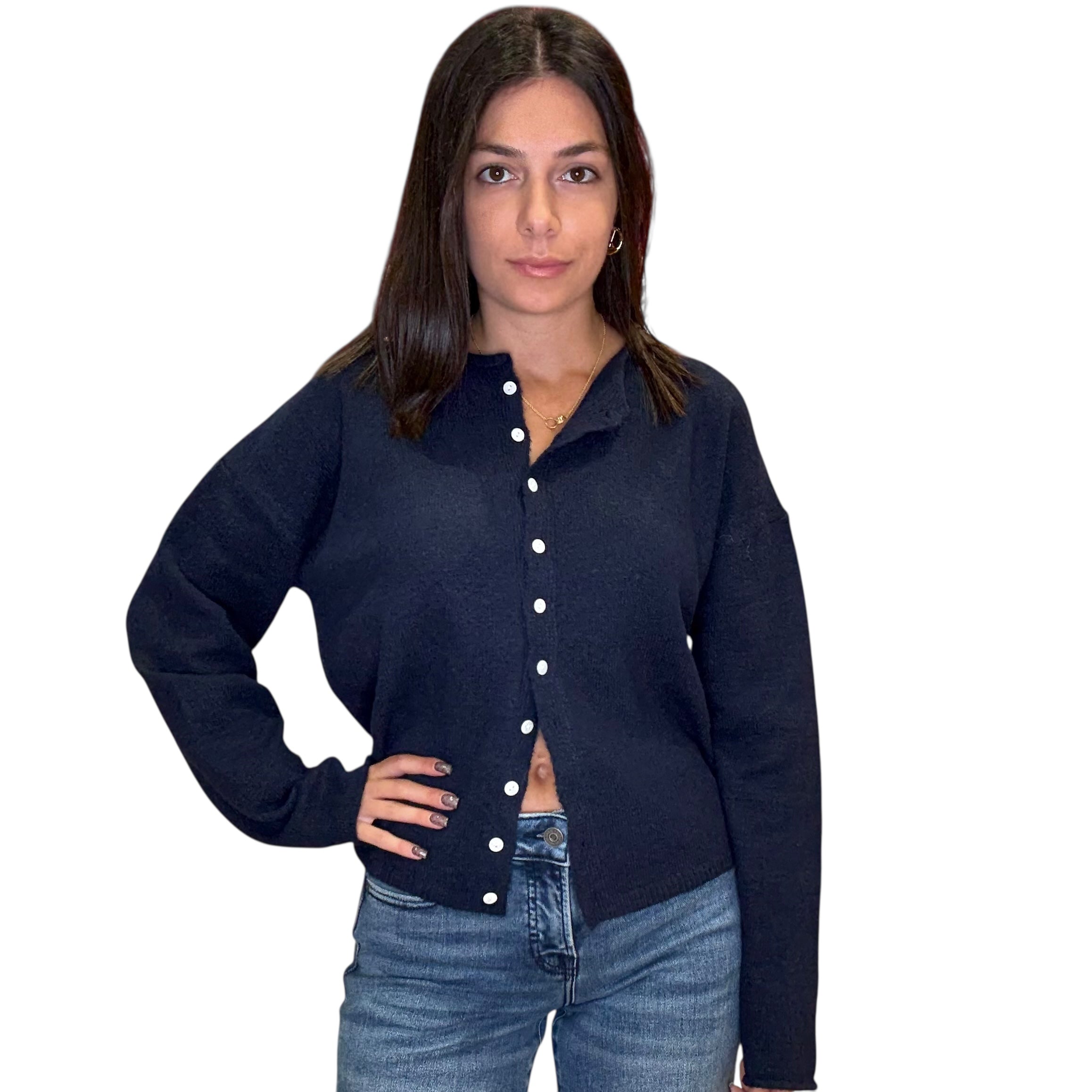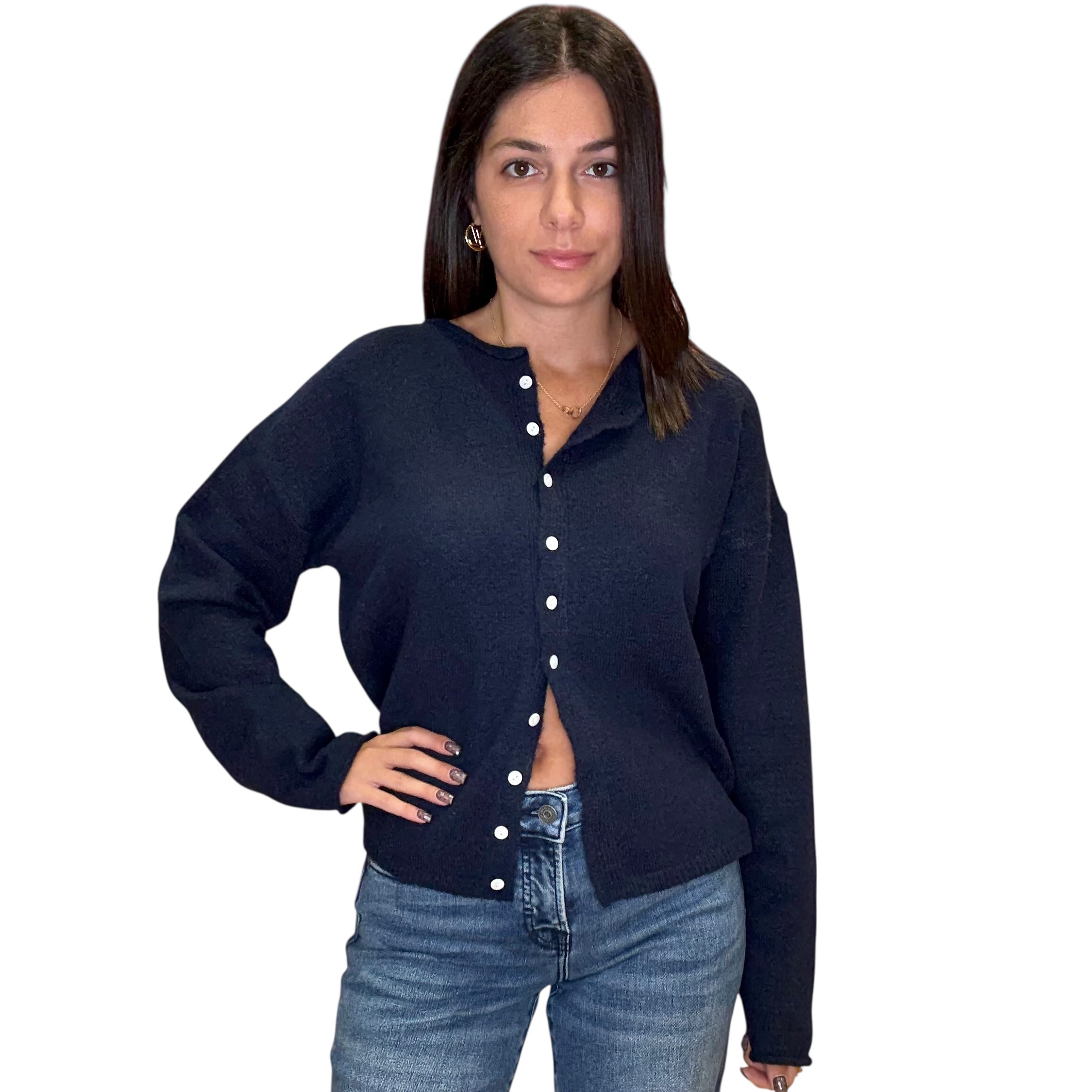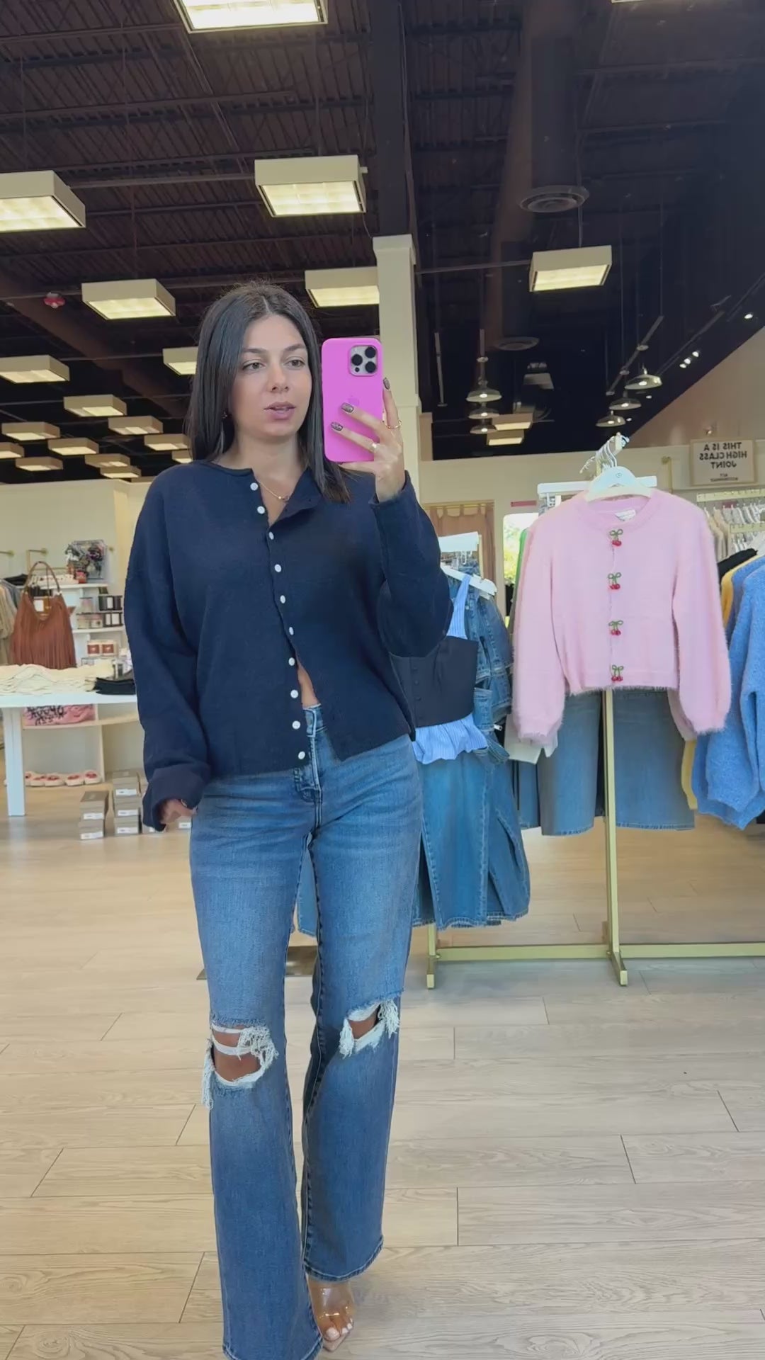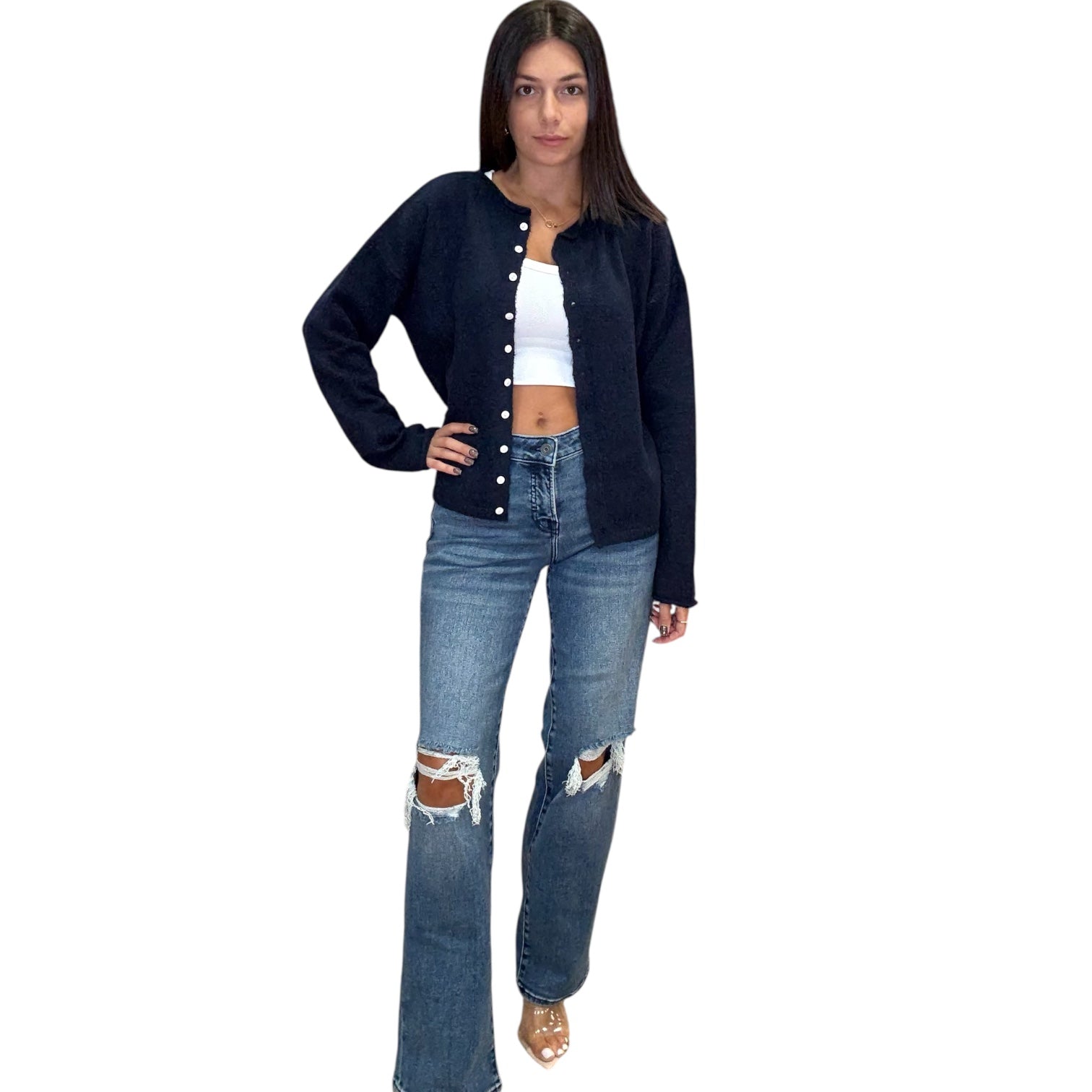Meet your wear-it-everywhere layer: the Everyday Ease Cardigan. This lightweight button-down cardigan features a relaxed fit, dropped shoulders, long sleeves, and a rolled collar for that casual-chic touch. Ribbed trim and soft knit fabric make it perfect for layering year-round whether over a tank, tee, or dress.