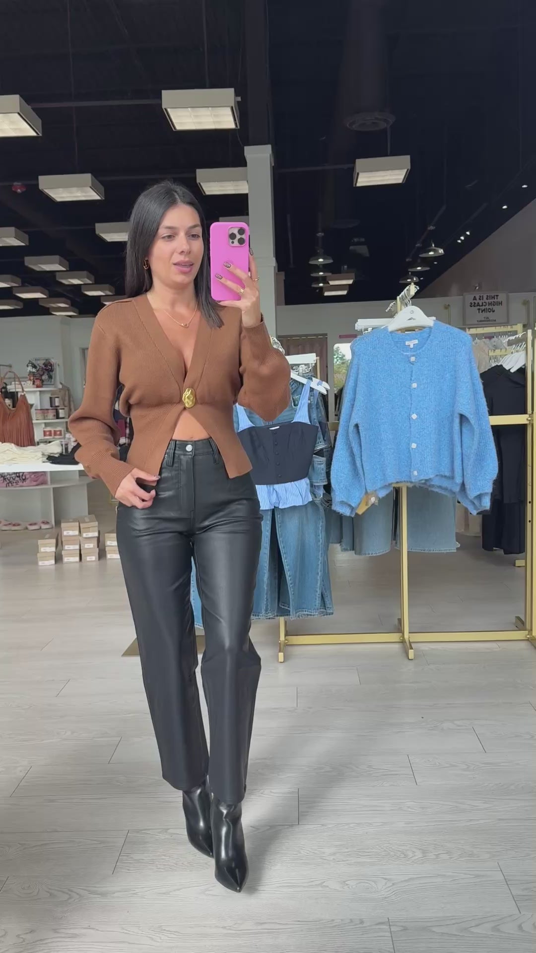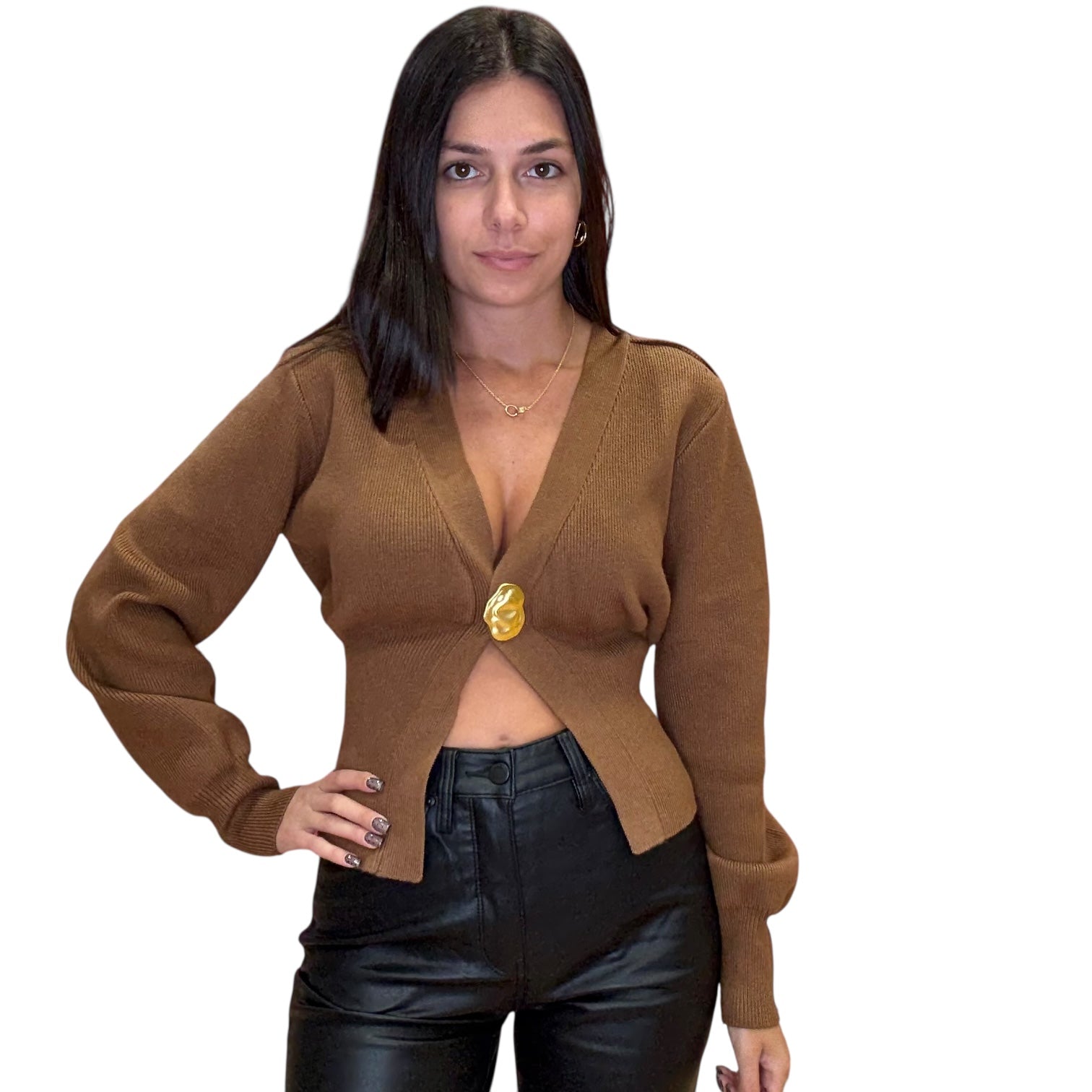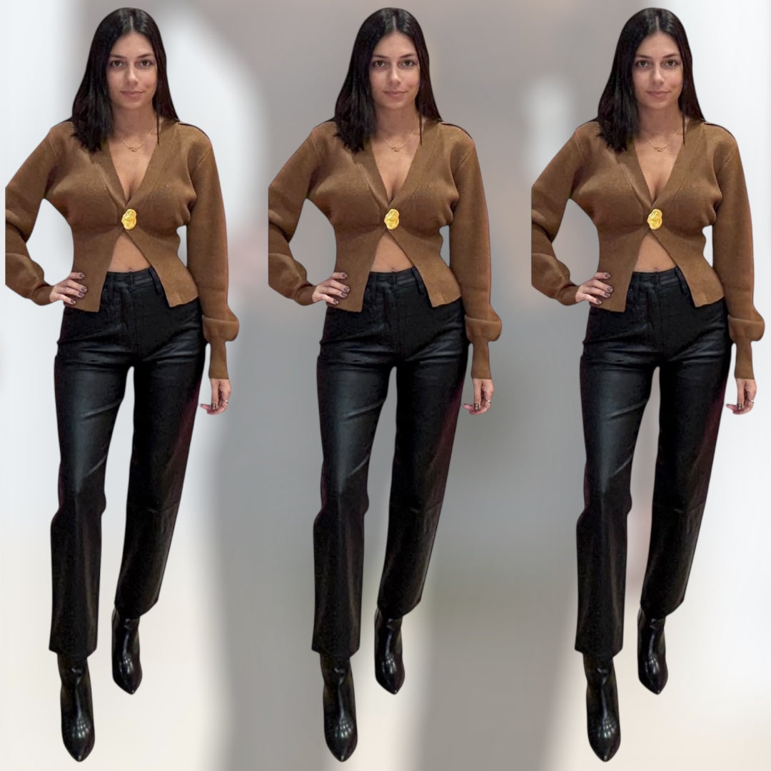 Cozy meets luxe in the Camel Deep V Ribbed Cardigan ☀️ This deep V-neck ribbed knit is designed with statement gold buttons and a flattering fitted waistline. Slightly puffed sleeves and ribbed cuffs give it that modern feminine edge, making it the cardigan you’ll keep reaching for.
