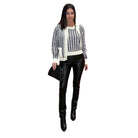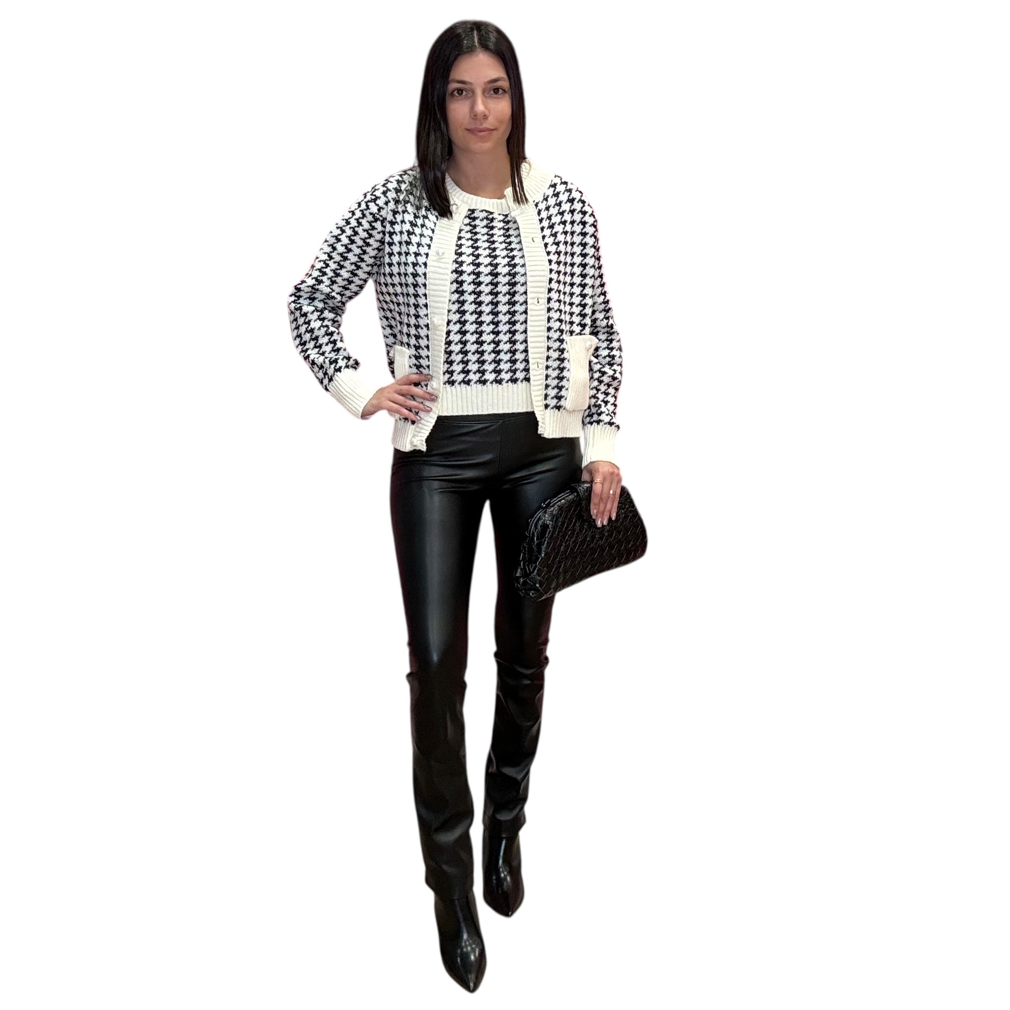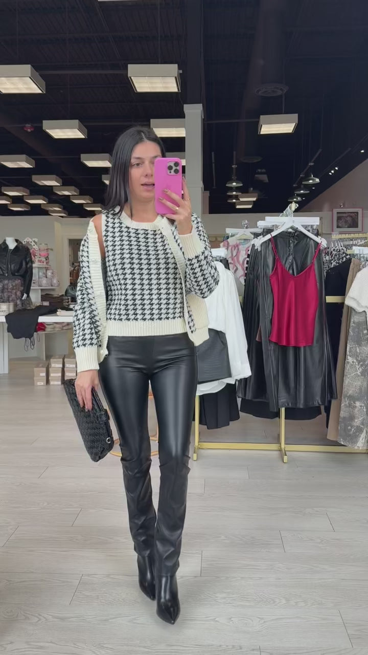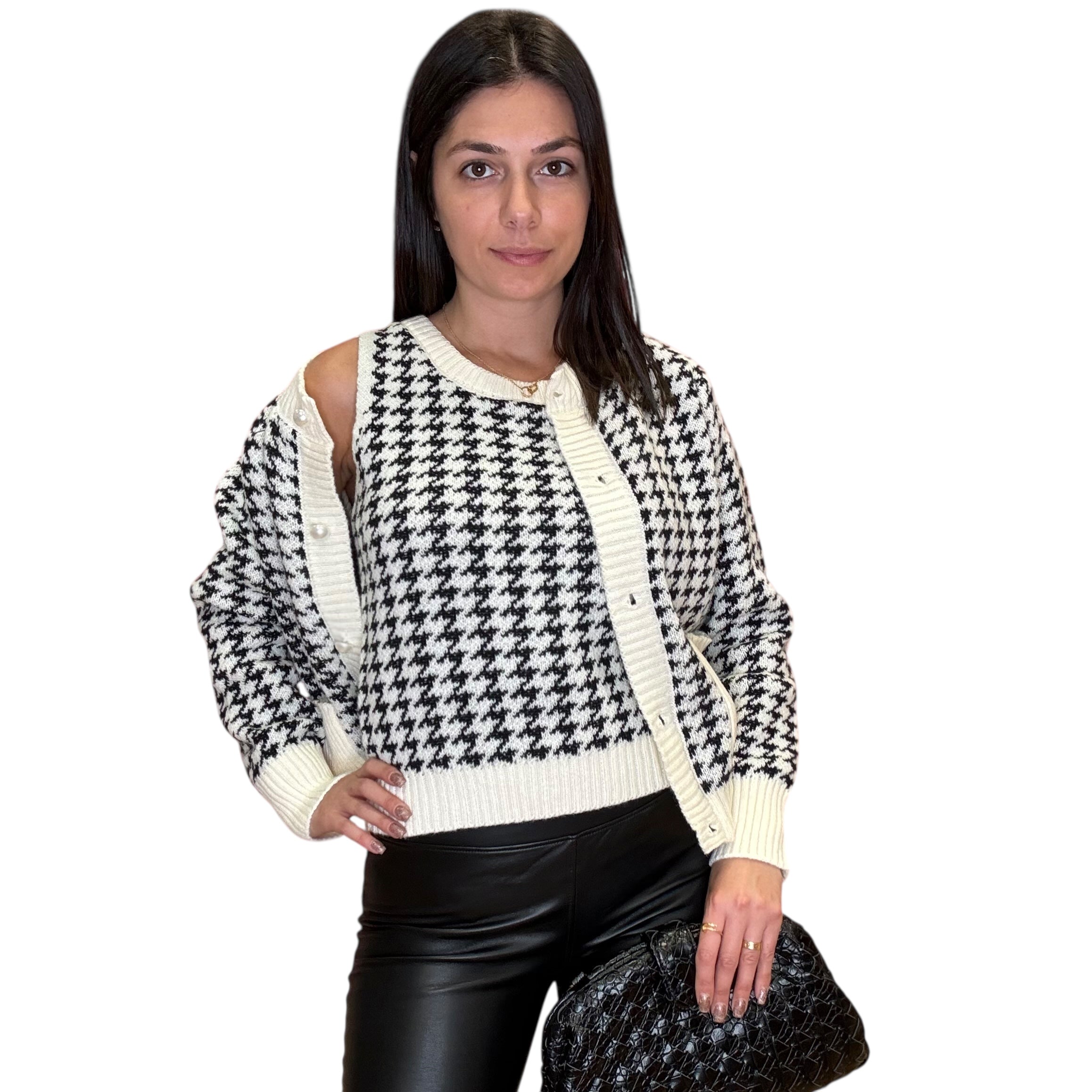 This two-piece sweater set features a cropped tank and matching button-down cardigan in classic ivory and black houndstooth. The perfect mix of cozy and cool, it's a holiday essential you’ll wear all season long.