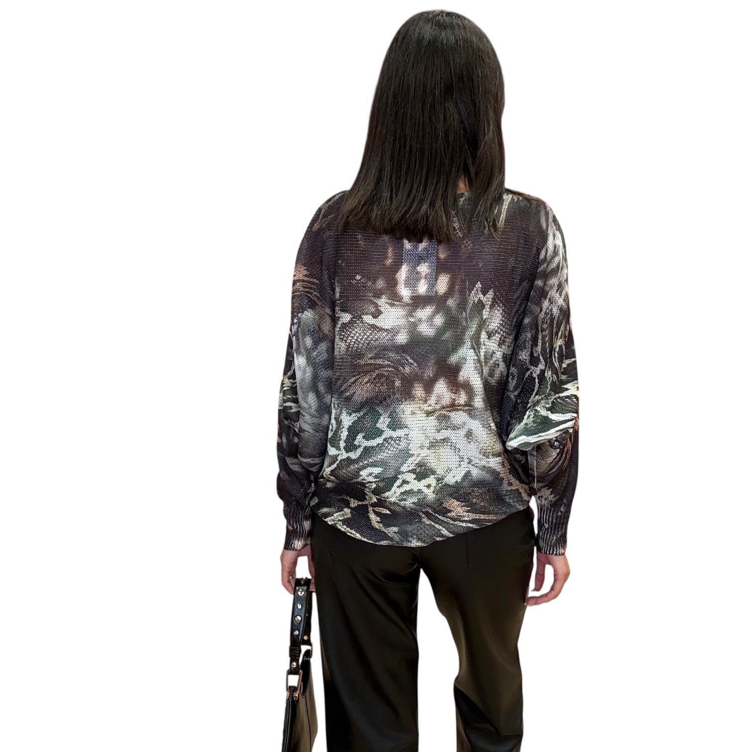 A cozy knit with a bold twist. This round-neck sweater features an allover olive snake print that’s equal parts edgy and chic. The relaxed fit makes it perfect for layering while still keeping your look statement ready.