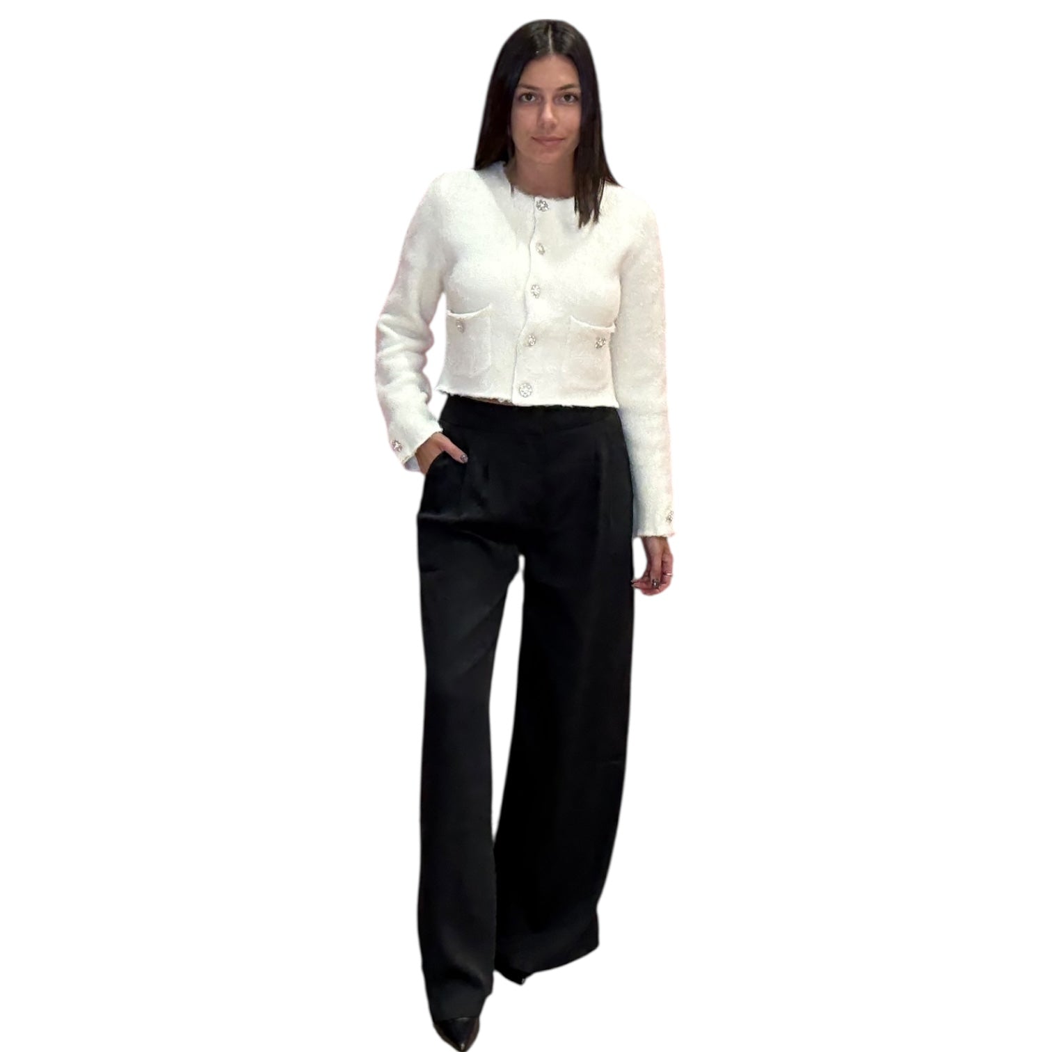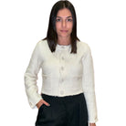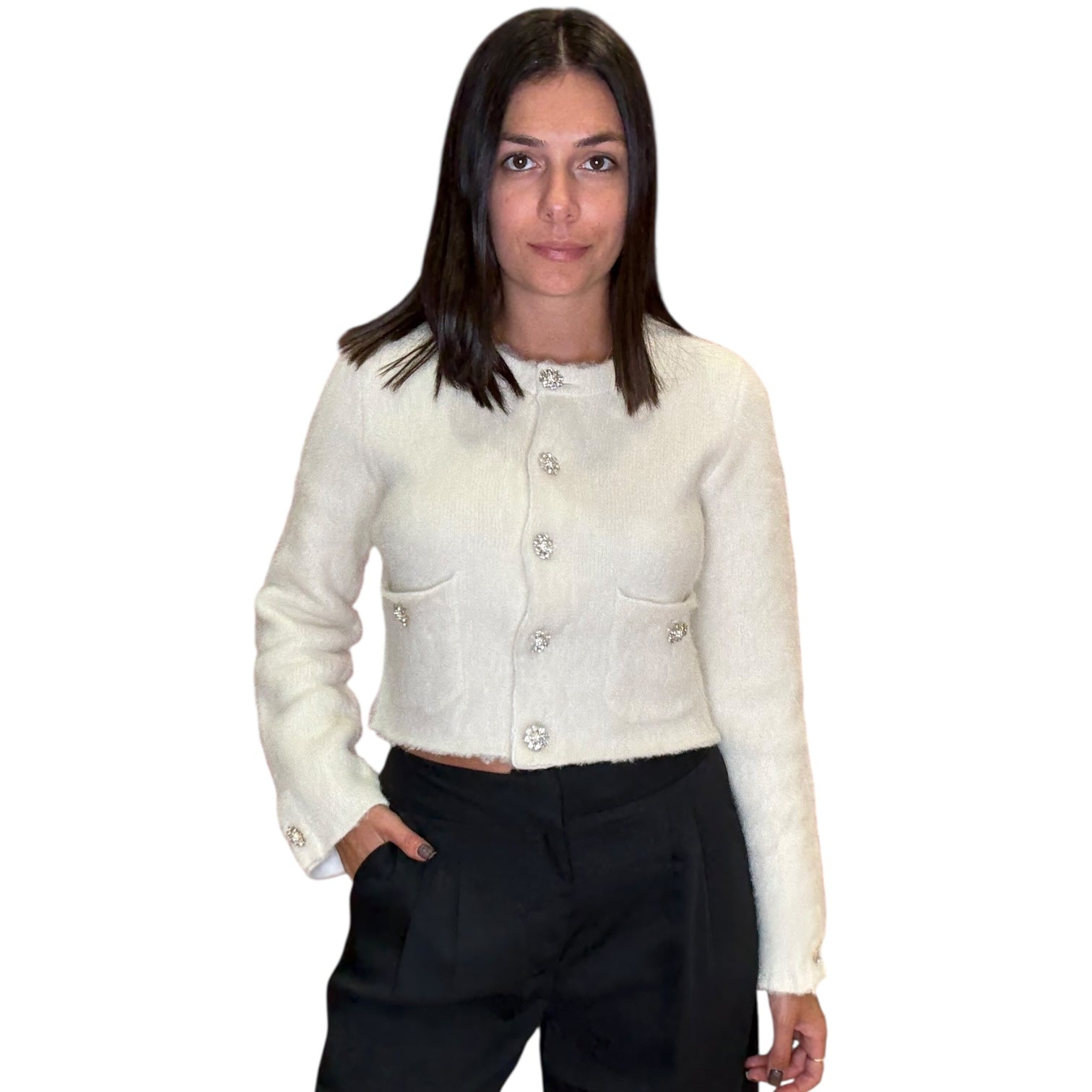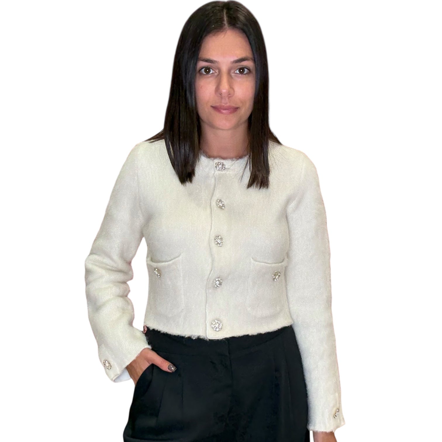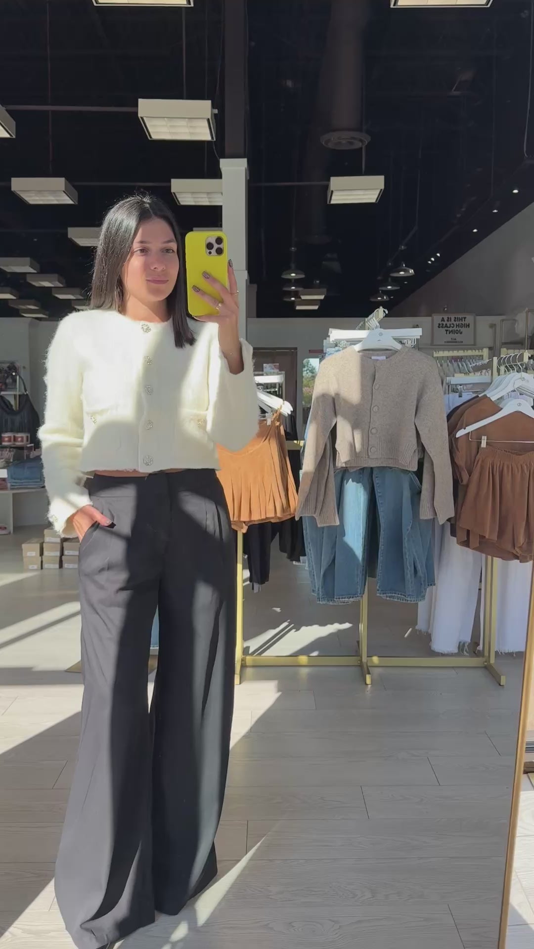 Cozy meets chic in this fuzzy knit crop cardigan, finished with luxe jewel buttons and subtle pocket details. Perfect for layering, it gives that soft glam vibe that takes you from coffee runs to dinner plans in seconds. ✨