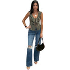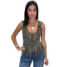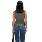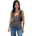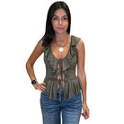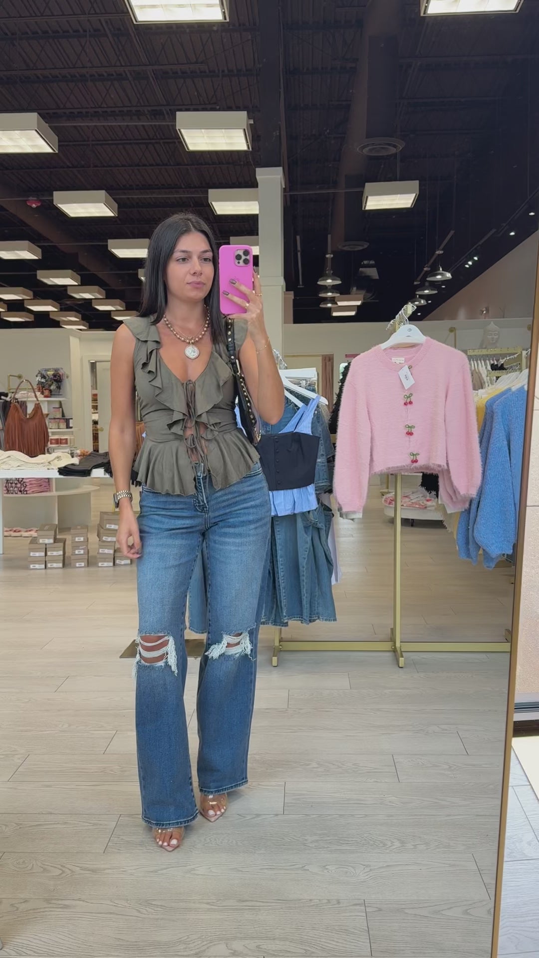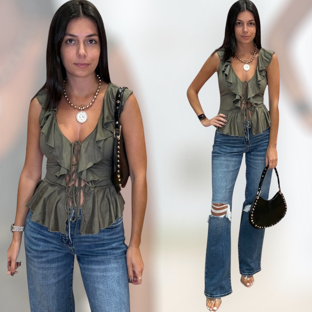 A sleeveless stunner that blends flirty and chic, this olive ruffle neck peplum top features a playful tie-front and flattering silhouette. With soft stretch and flow, it’s made for days you want effortless style that still makes a statement.