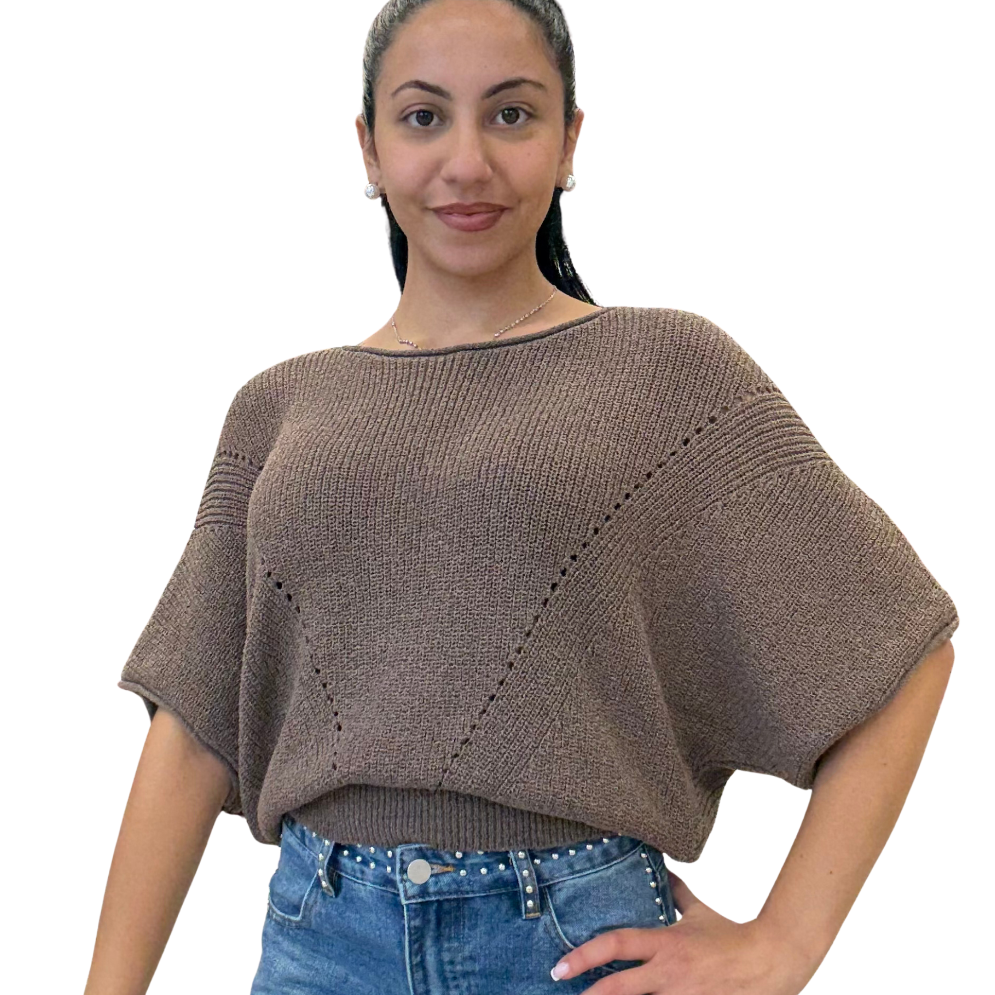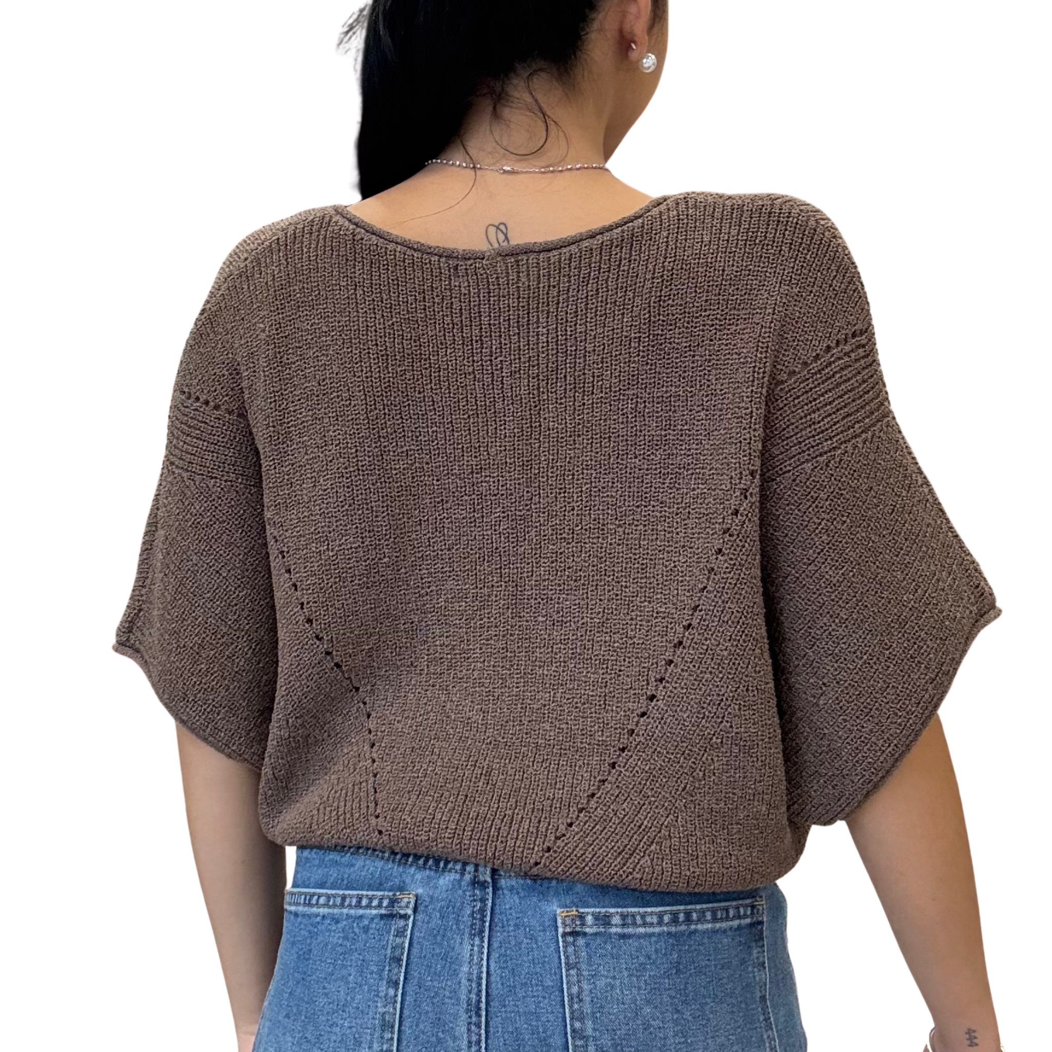 Pointelle Ribbed Short-Sleeve Sweater - Brown