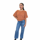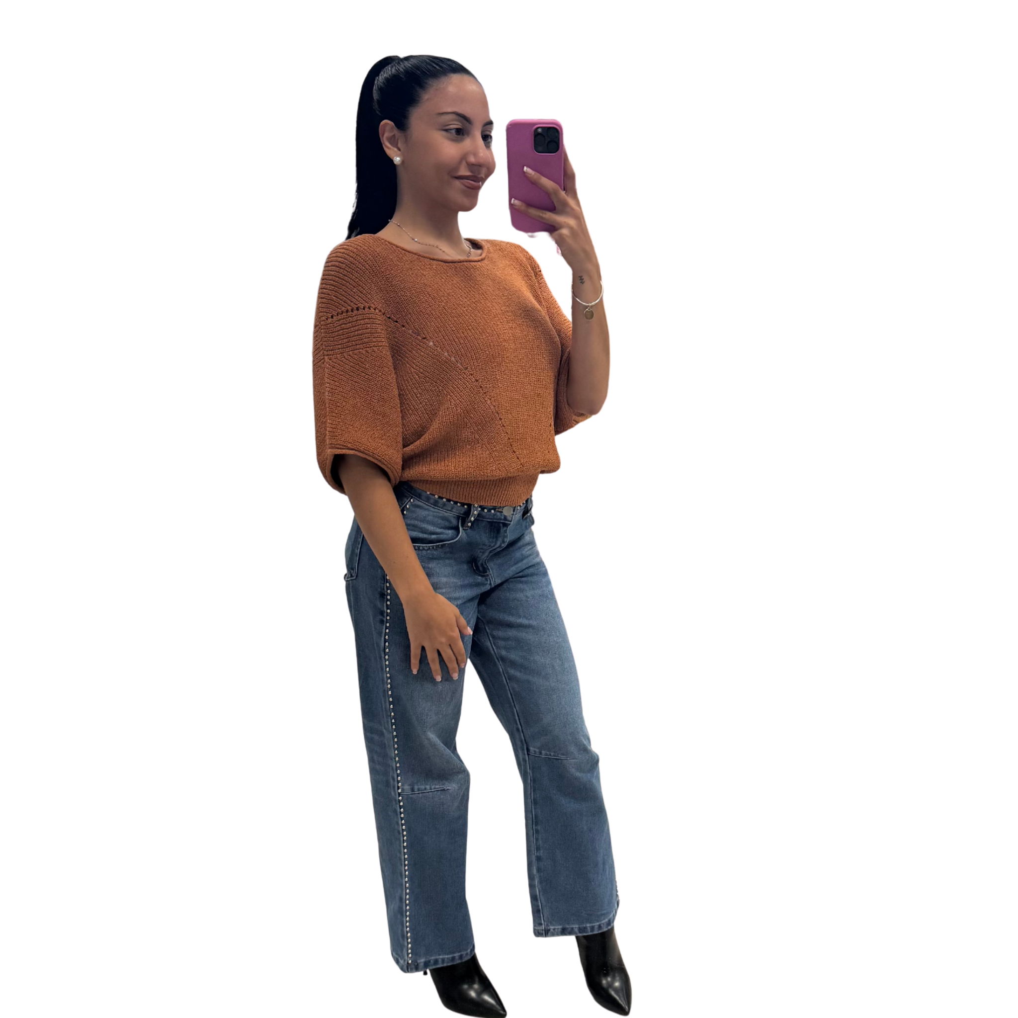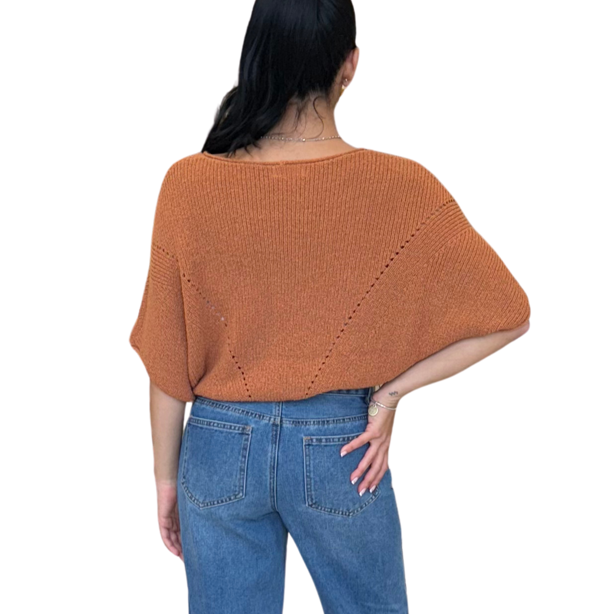 Pointelle Ribbed Short-Sleeve Sweater - Rust