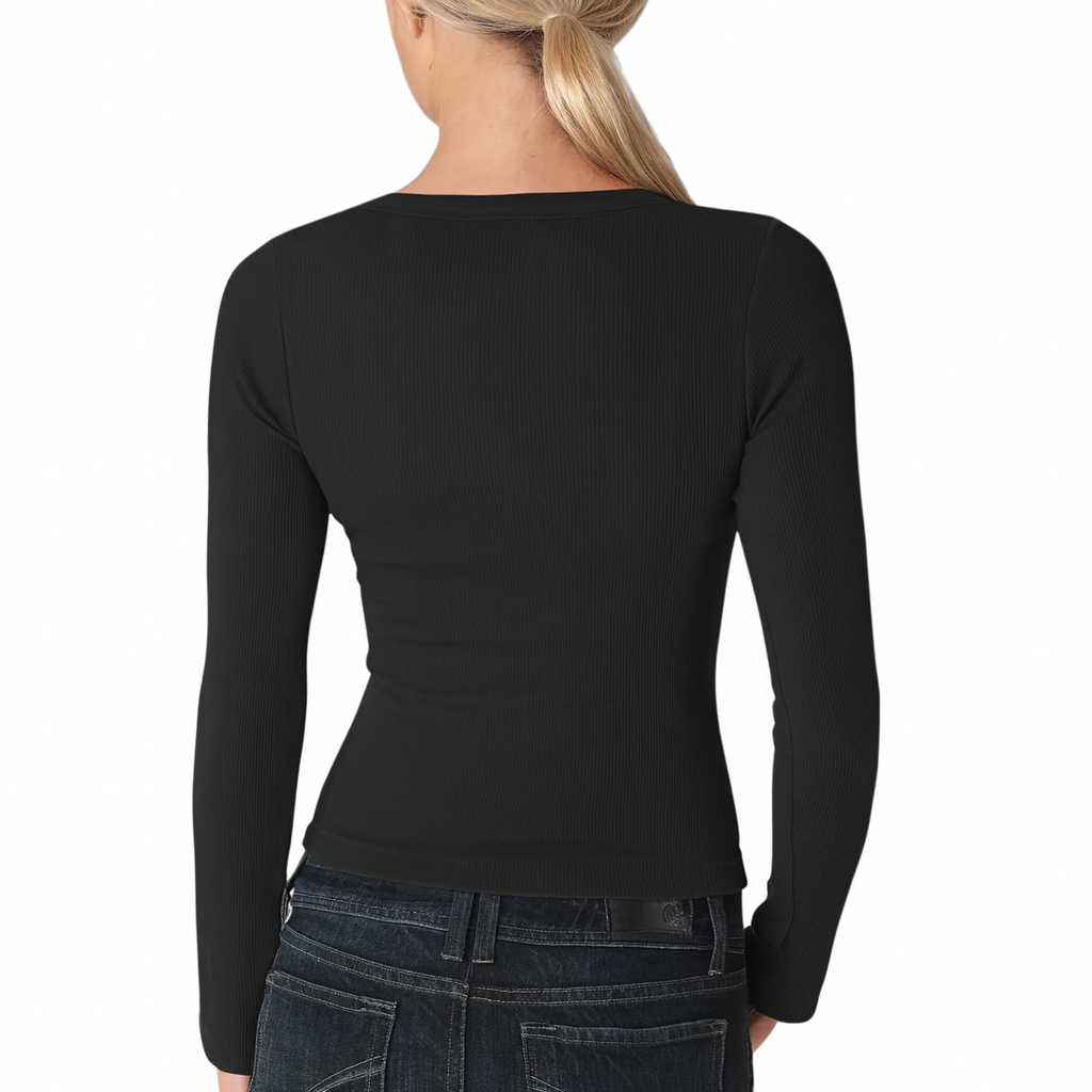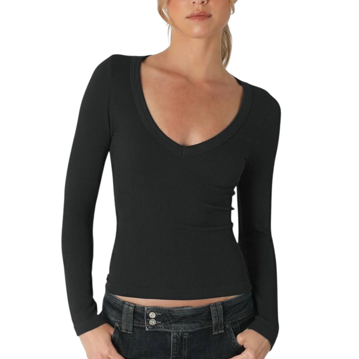 Your new closet MVP ✨ This seamless ribbed V-neck long sleeve hugs in all the right places with the perfect amount of stretch. Made from a soft nylon-spandex blend, it’s the ultimate throw-on-and-go top that still looks effortlessly chic. Whether you’re layering it under a jacket or styling it solo, this piece is designed to move with you from day to night.