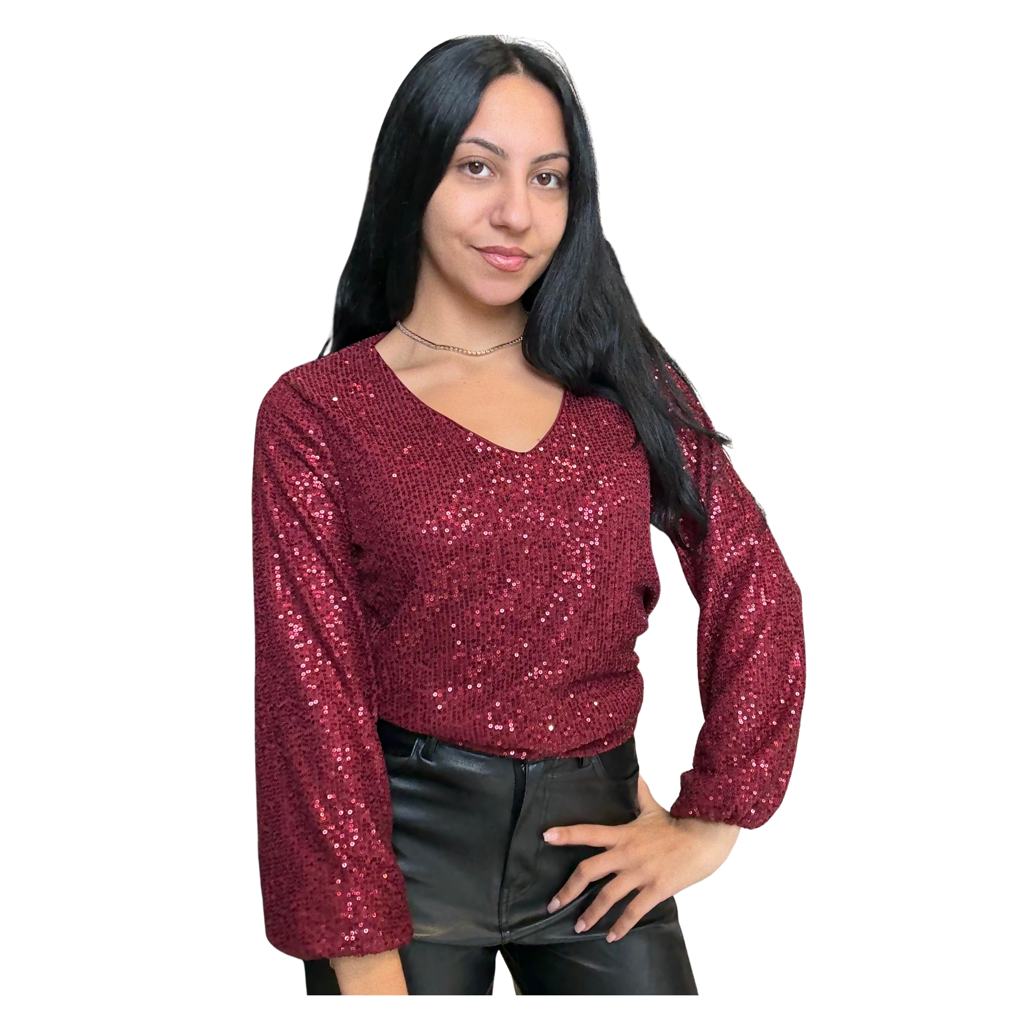 Rich, deep, and ultra-glam 🍷 The Wine Sequin Blouse adds a bold pop of color while staying timelessly chic. Designed to sparkle subtly under soft lighting — it’s your new holiday go-to.