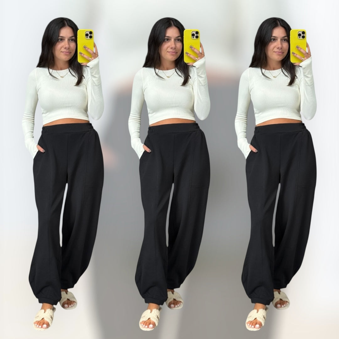 A cotton blend jogger that brings structure and softness together. Smooth waistband, tapered ankle, and an everyday black finish = your new go-to.