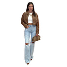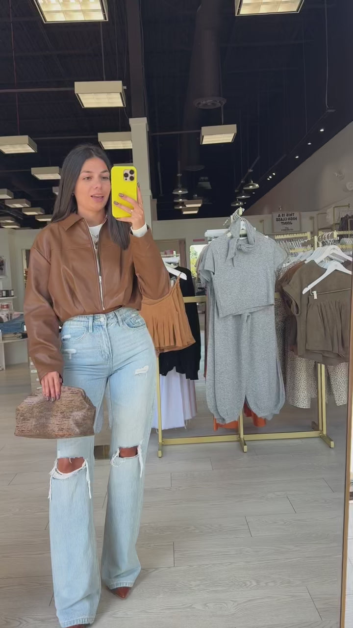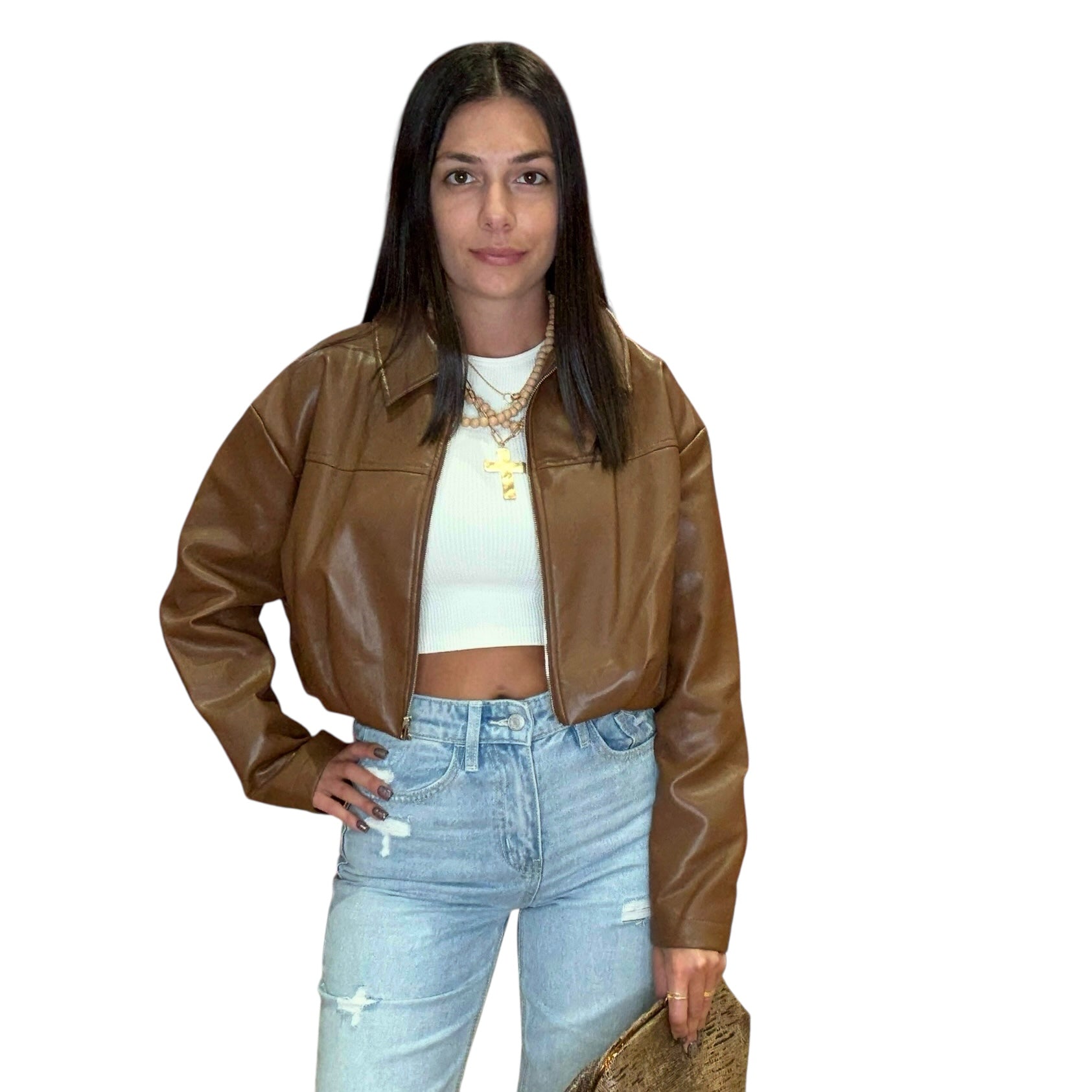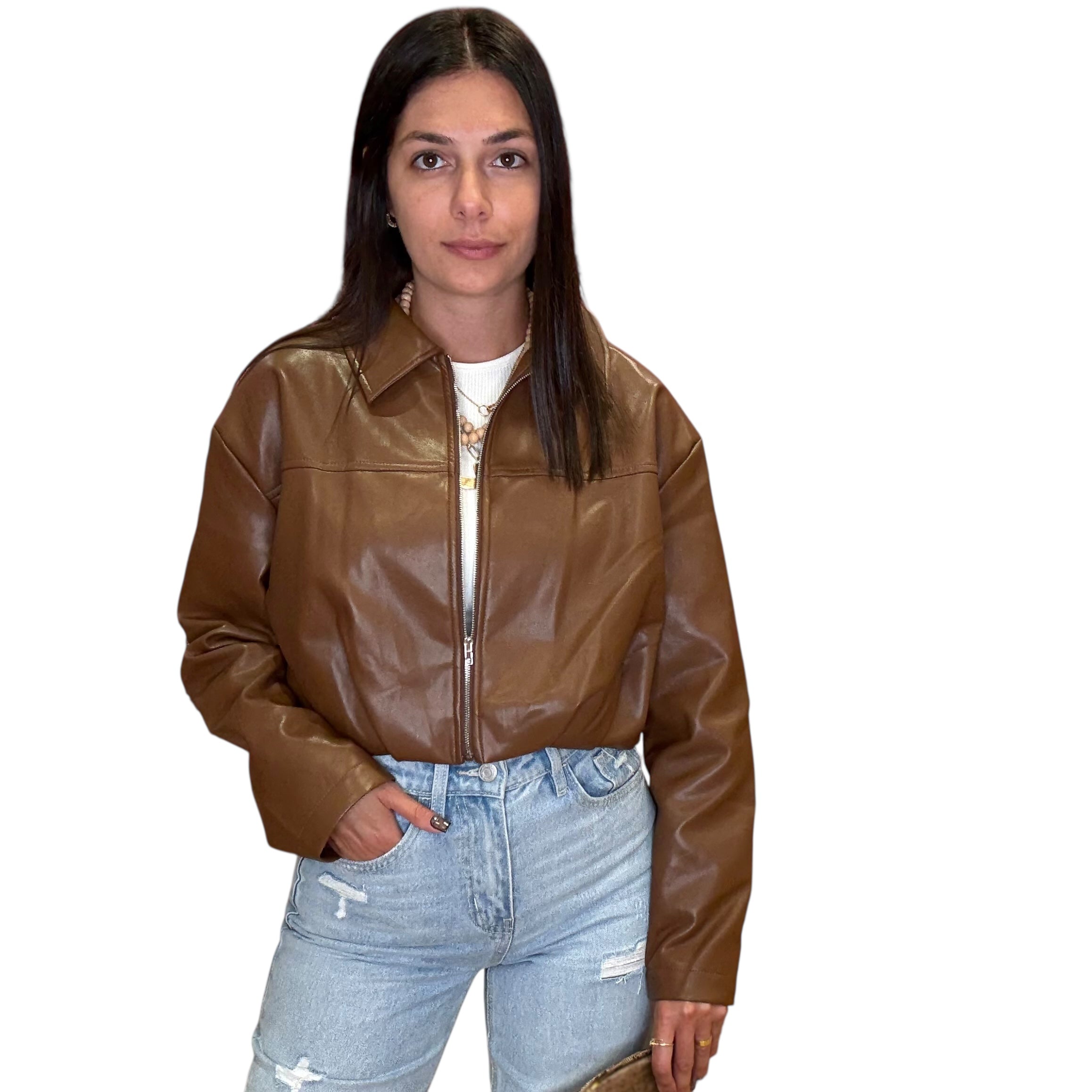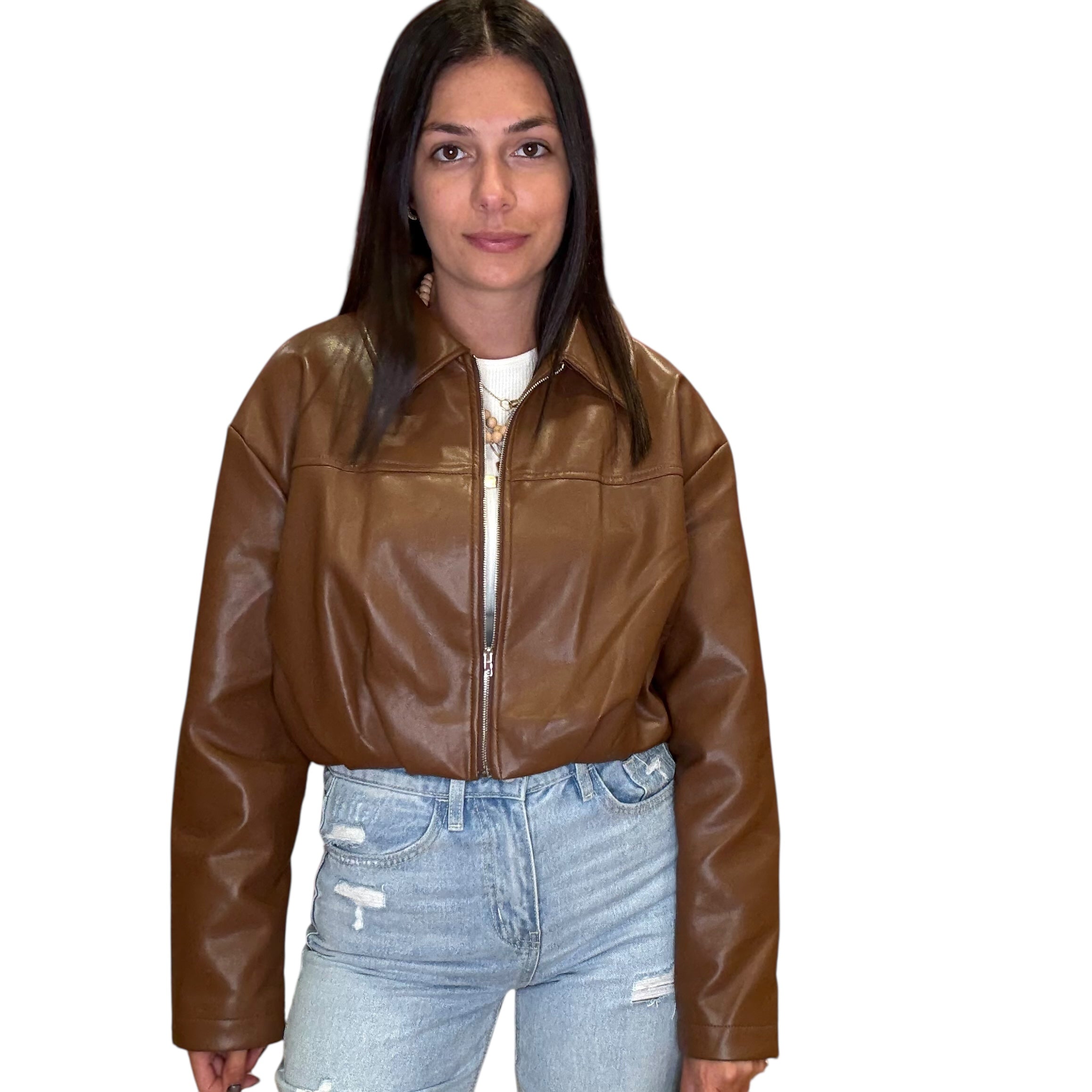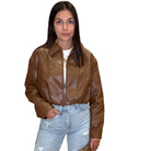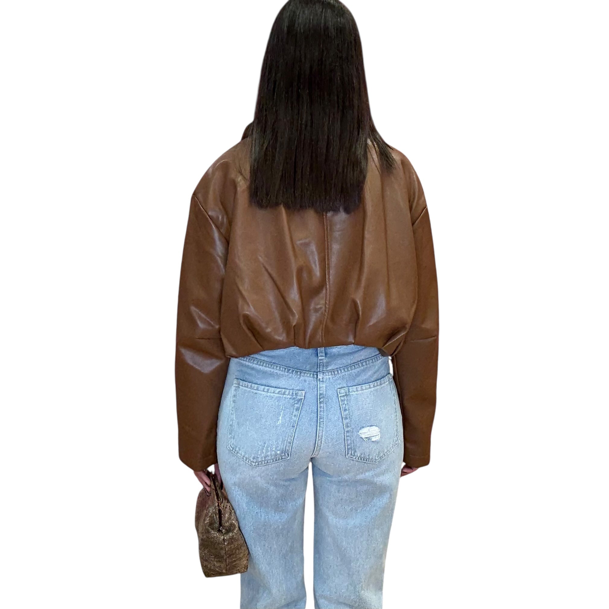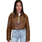 Brown Pleated Faux Leather Crop Jacket
