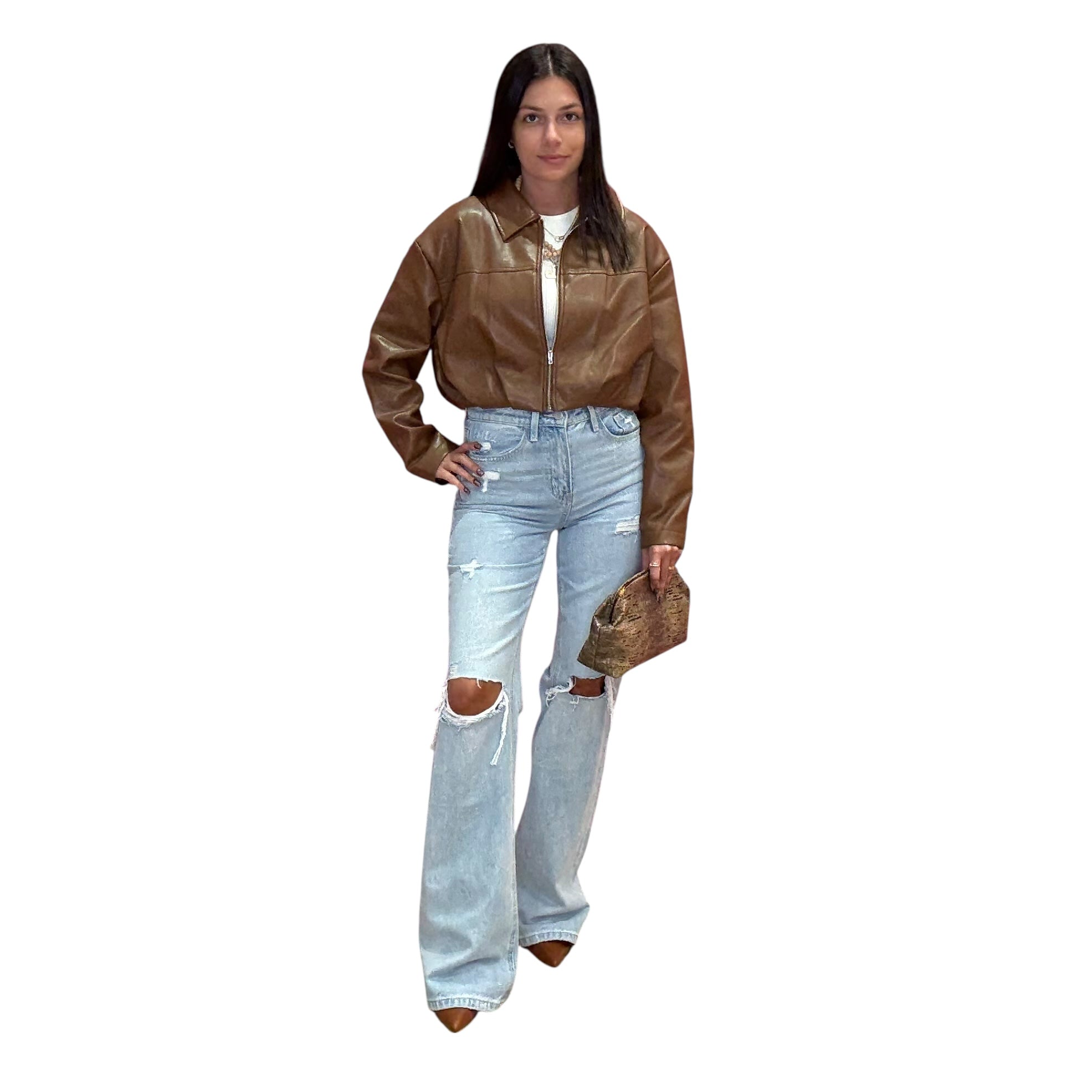 Bold + polished 👊 This cropped faux leather jacket brings structure with its pleated bubble hem and sharp collar, finished with an exposed zipper for a modern edge. A total statement piece.