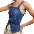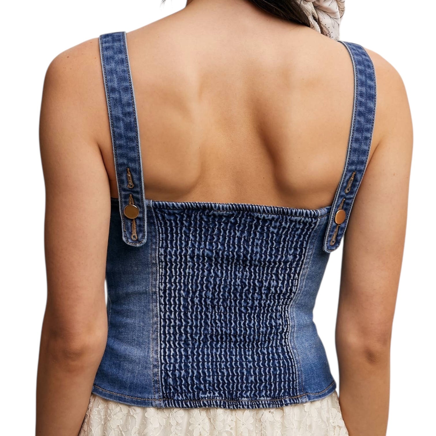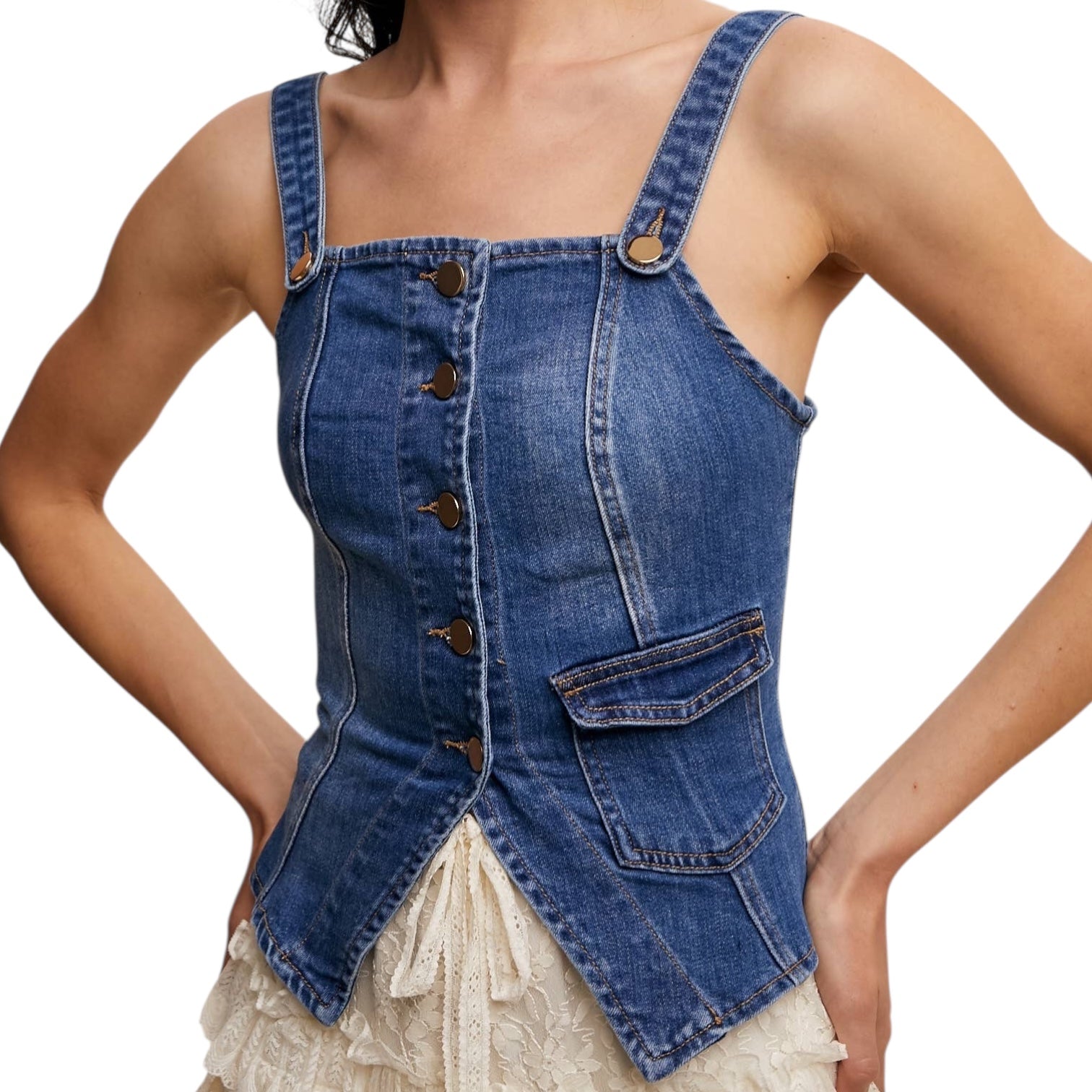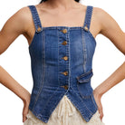 A modern twist on classic denim. This stretch denim button-up vest is designed with corset-inspired tailoring to flatter your shape while keeping things cool and versatile. Whether worn layered or solo, it’s a closet standout.