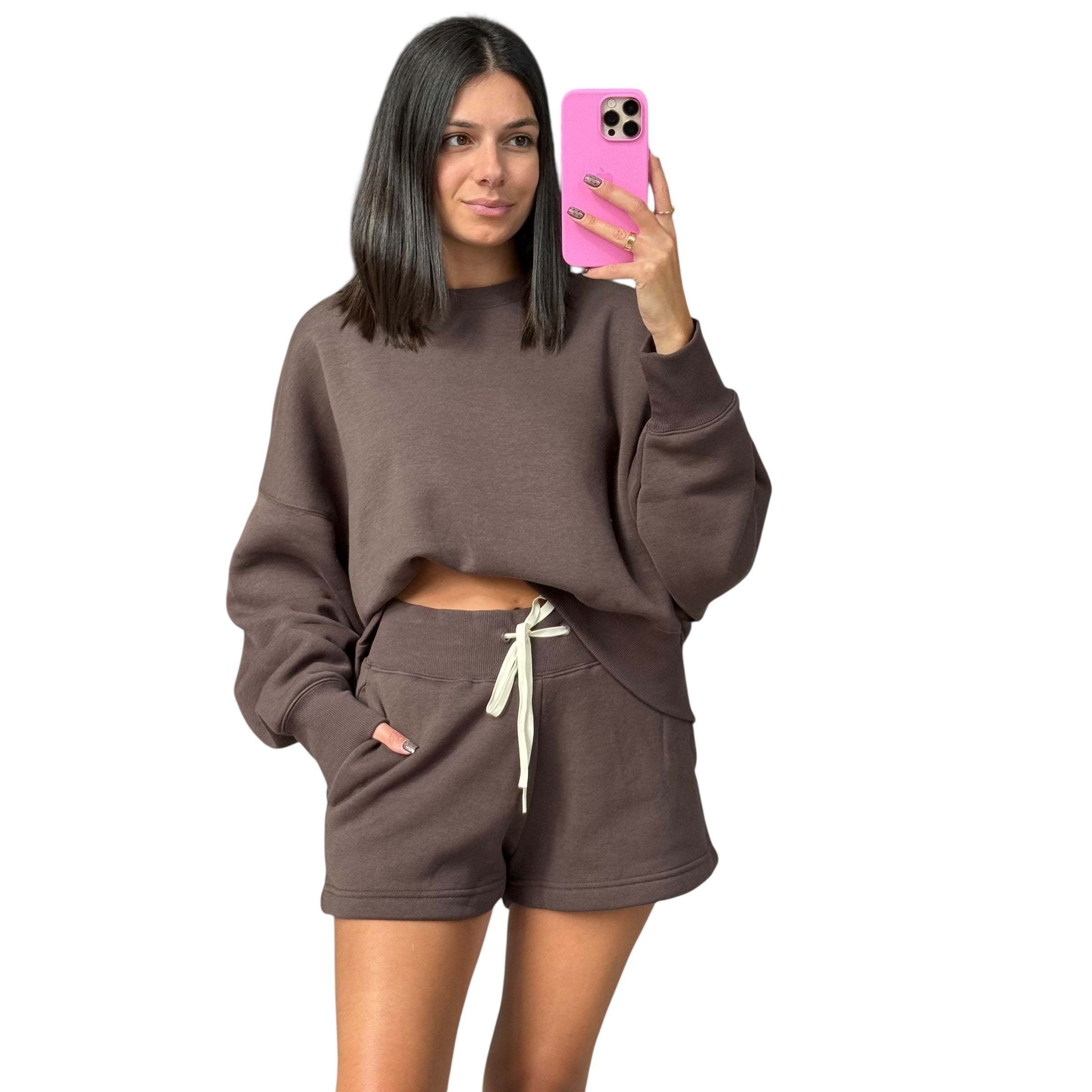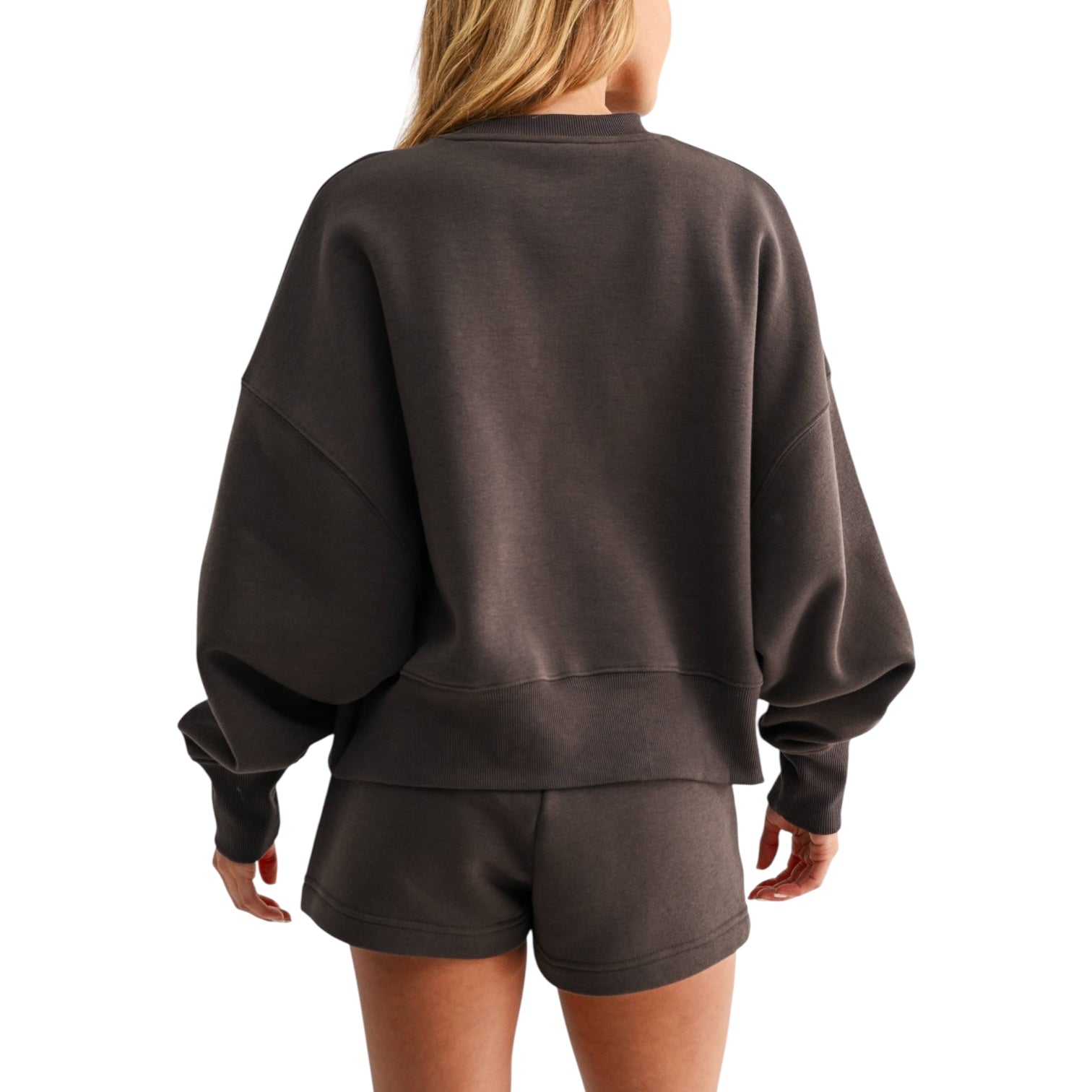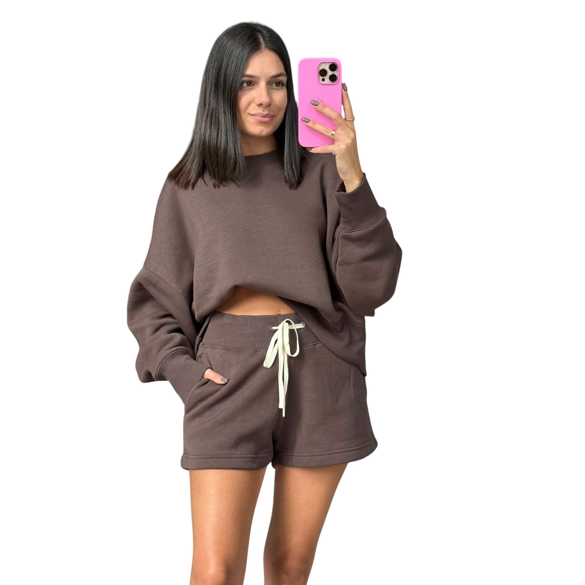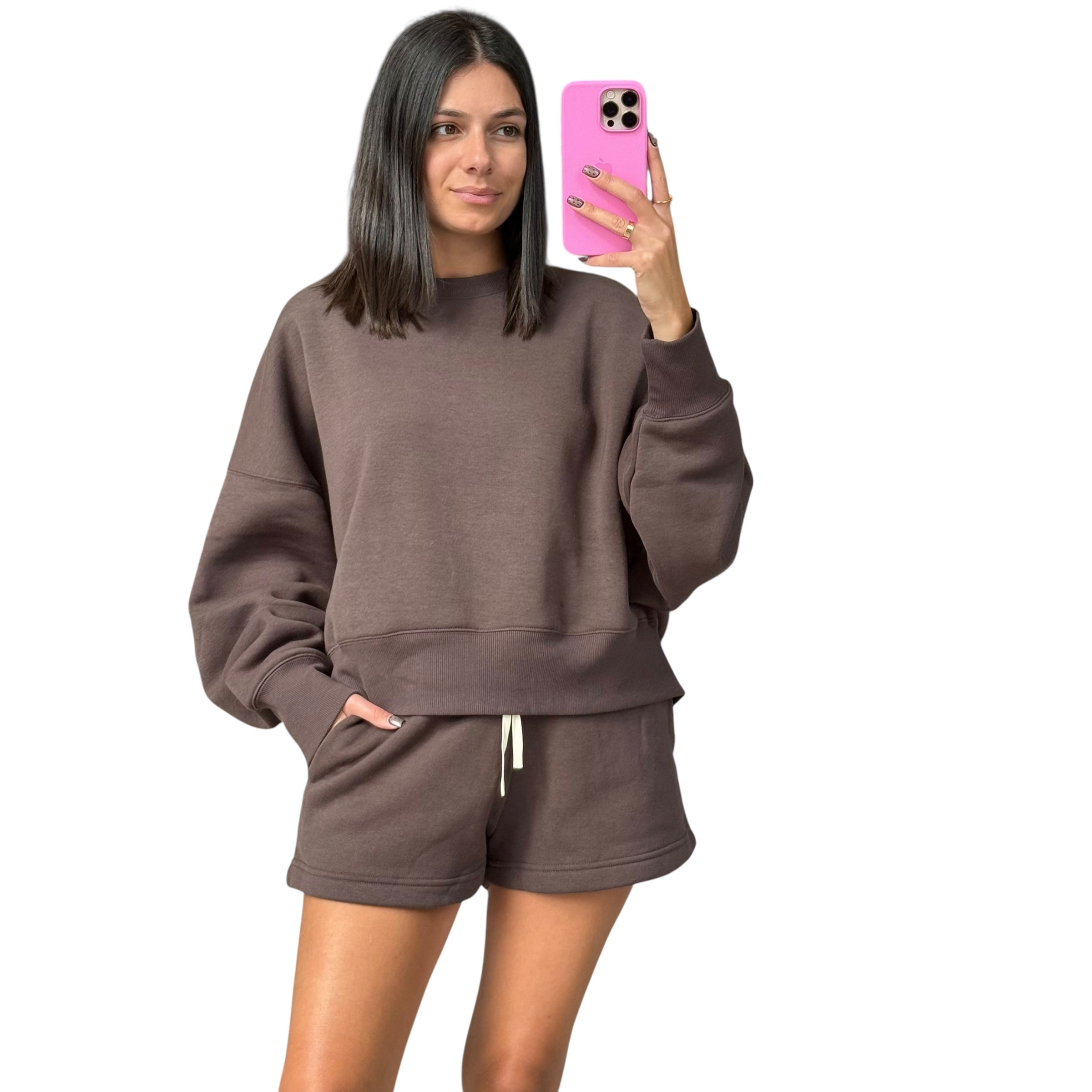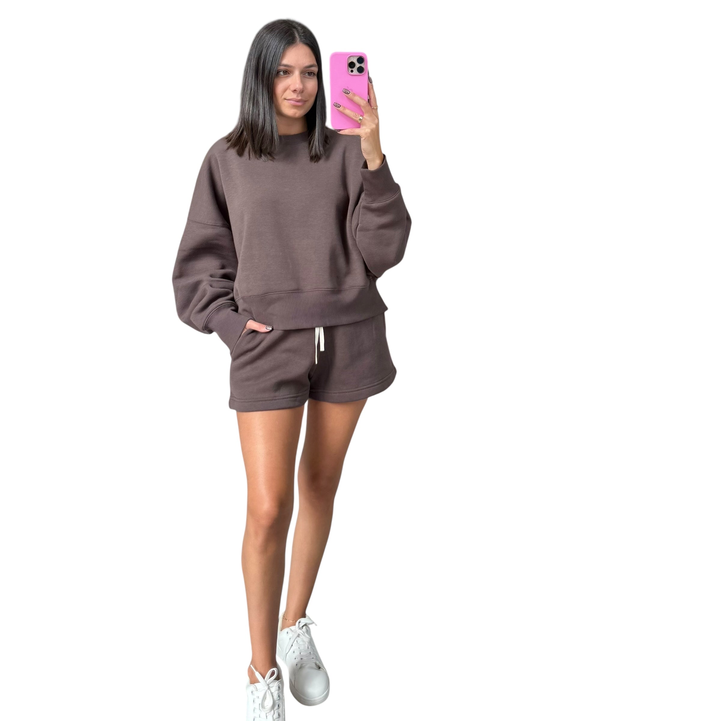 Cozy fleece meets statement with this set. This crewneck short set features ribbed trim, drop shoulders, and dramatic balloon sleeves with matching shorts for a comfy lounge look.