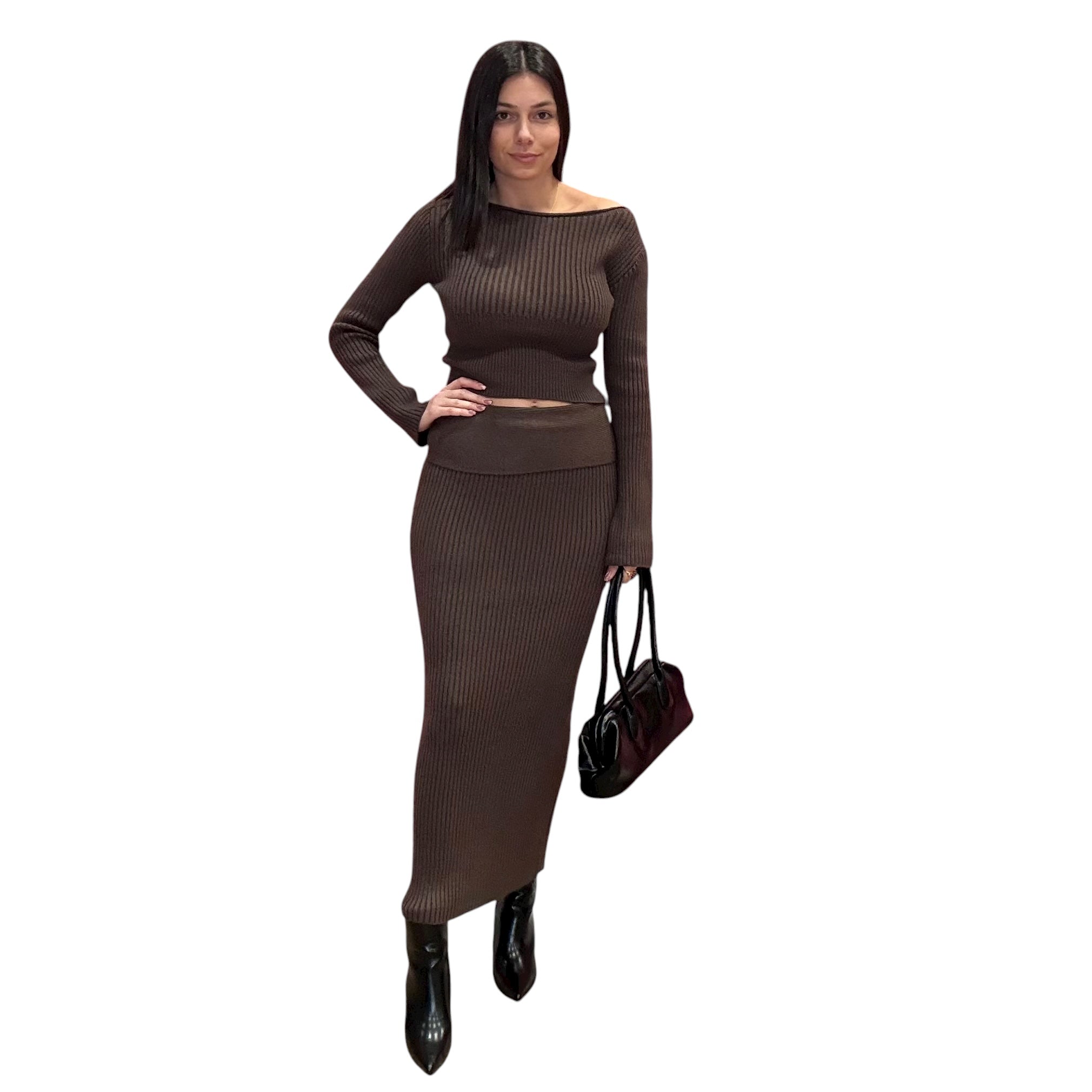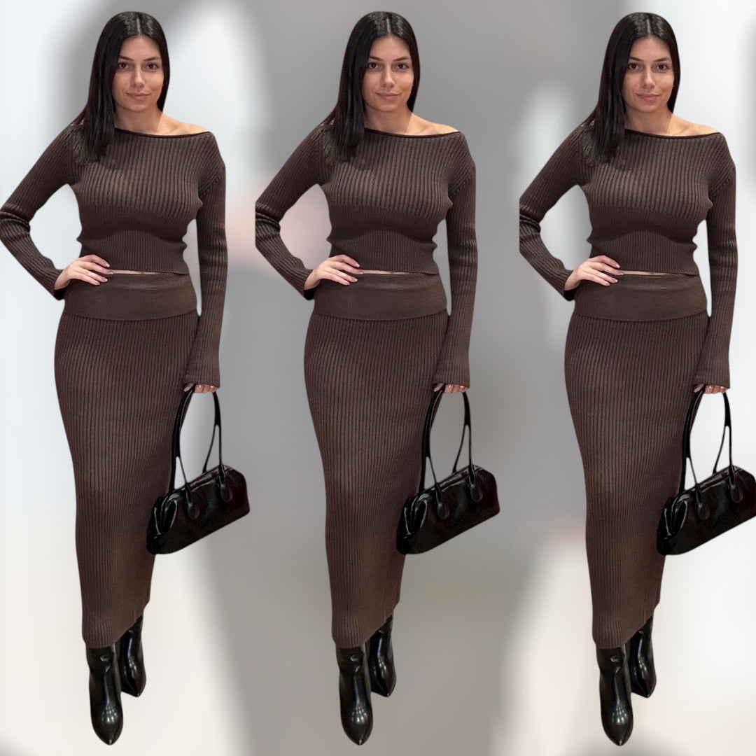 The coziest knit set you’ll ever own ☕ A soft ribbed crop top meets a matching high-waist maxi skirt for that effortlessly polished fit.