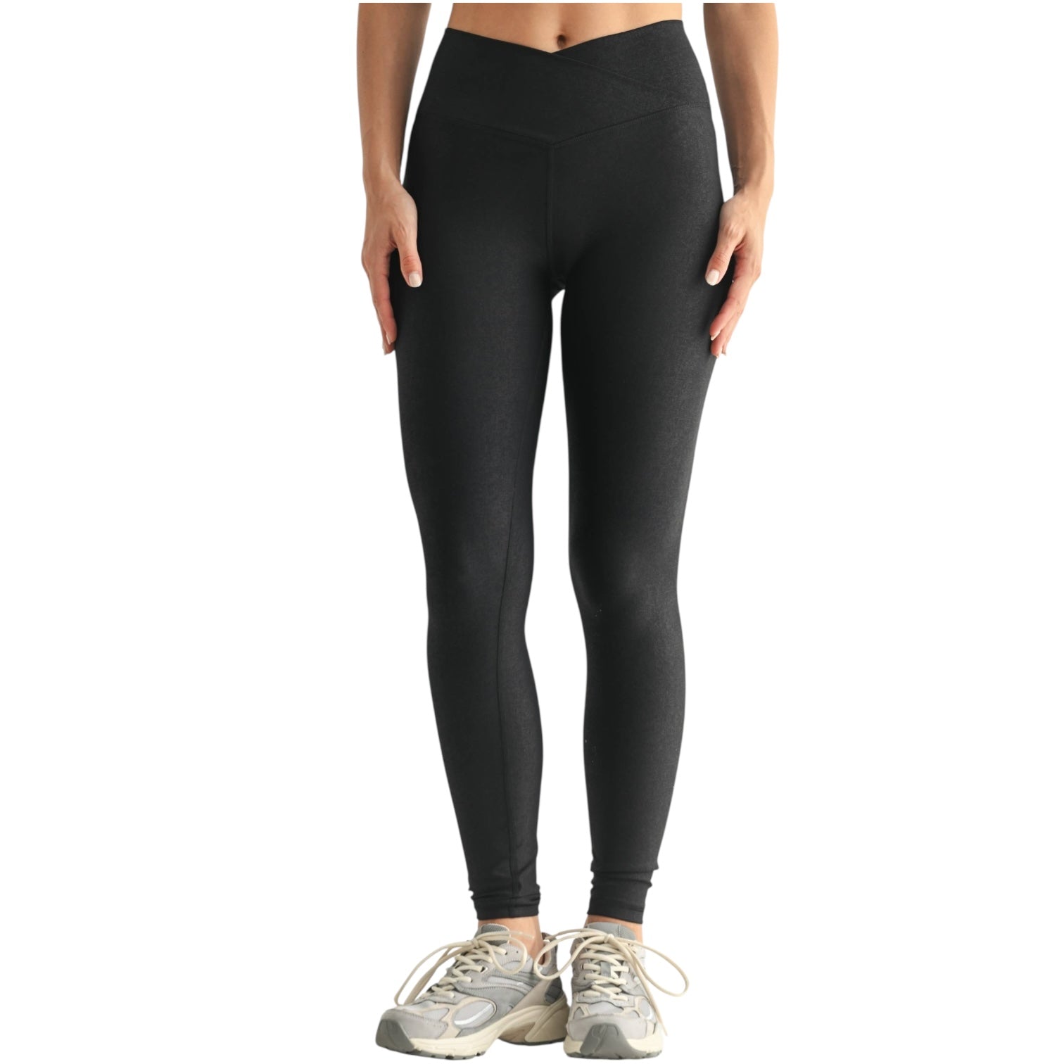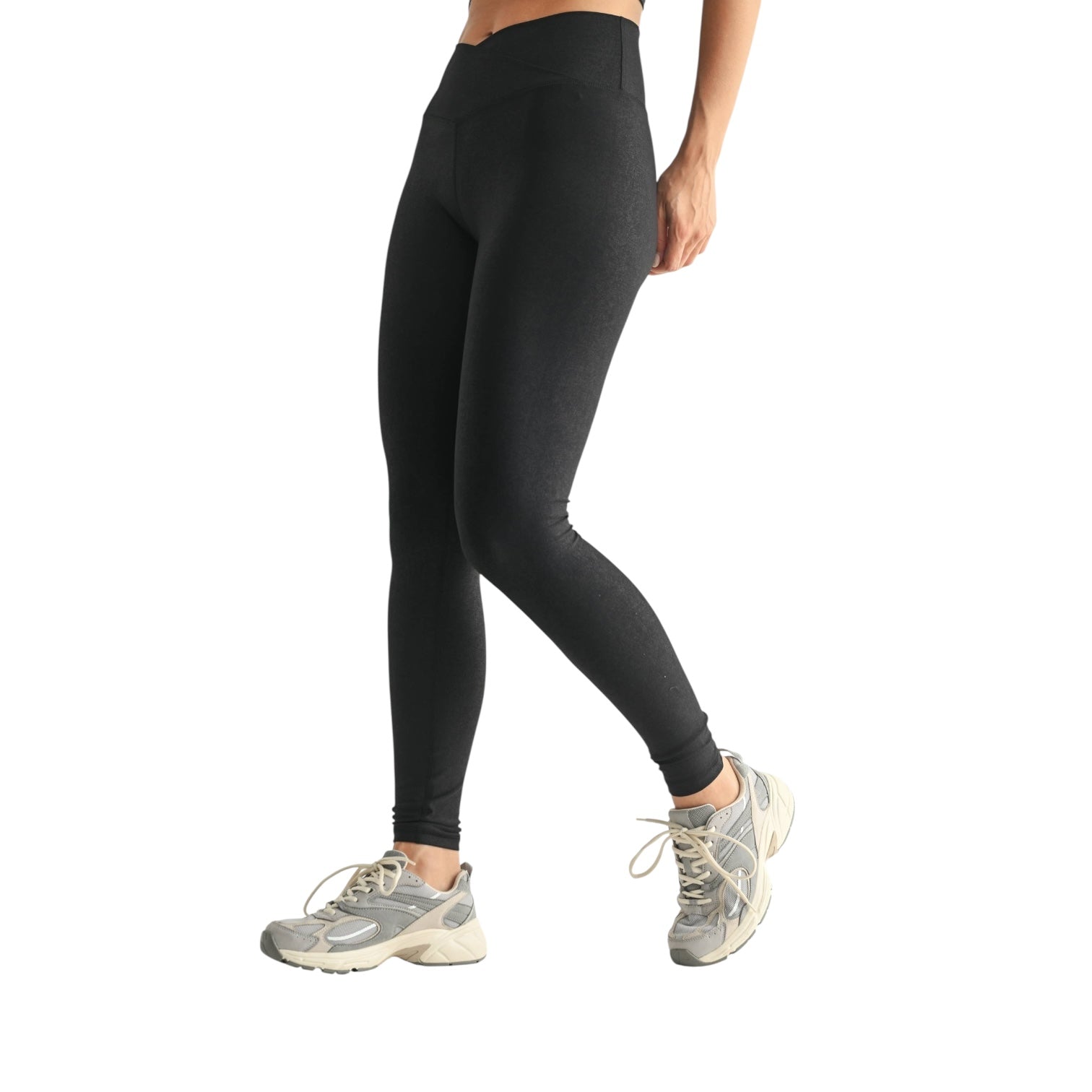 A little shine, a lot of chic. These black foil leggings with a crossover waistband sculpt and flatter in all the right places.
