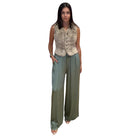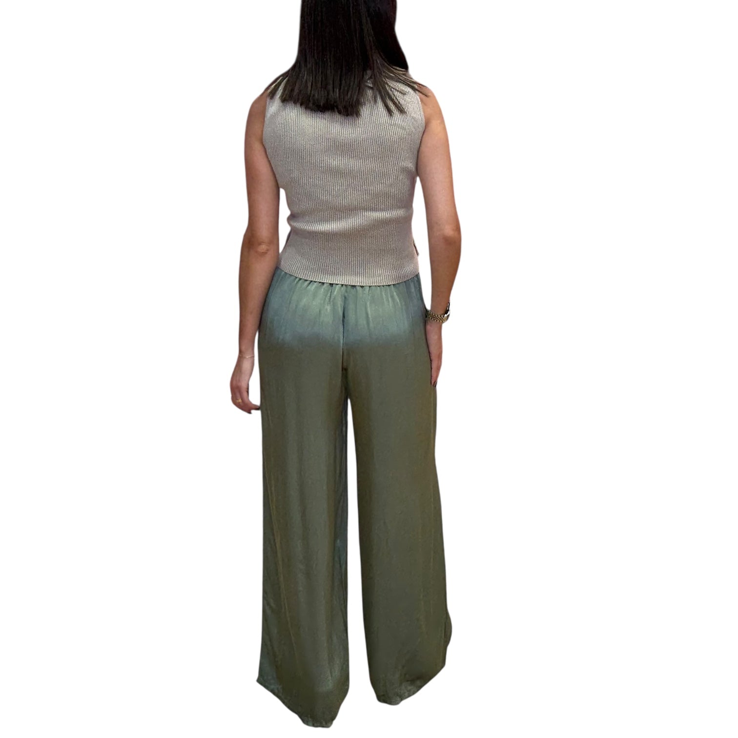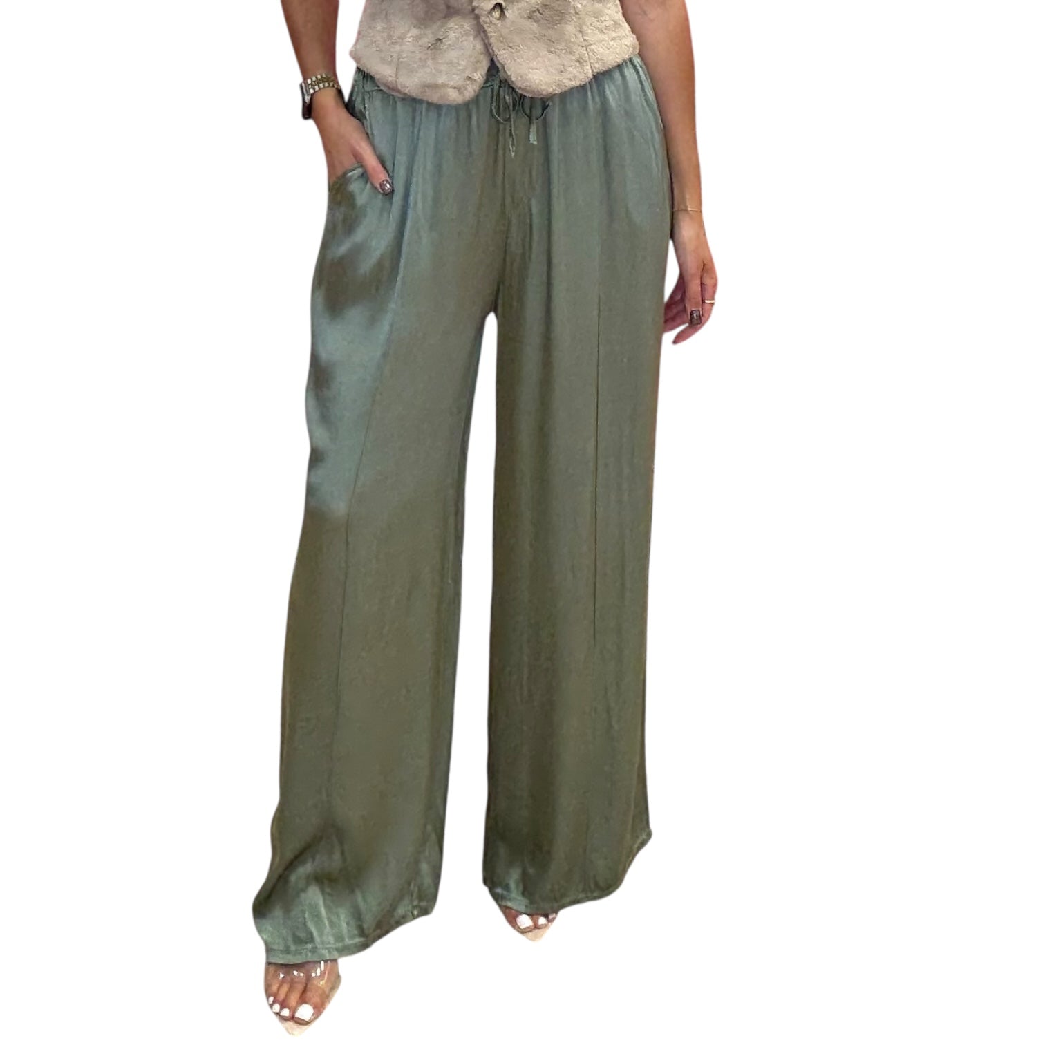 Bring effortless Italian elegance to your wardrobe with the Olive Satin Wide-Leg Pants 🌿 Crafted in Italy from a luxe viscose-rayon blend, these satin-feel pants drape beautifully with a relaxed wide-leg silhouette. Designed as a one-size fit from S–L, they’re as versatile as they are chic.