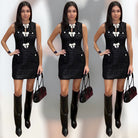 Shine meets sophistication in the Jewel Bow Detail Tweed Mini Dress. Crafted in a luxe textured tweed, this sleeveless black mini features a sparkling rhinestone bow embellishment and a sultry front cutout detail for that glam-meets-chic vibe. Finished with a hidden back zipper and full lining for a flattering fit, it’s the perfect statement dress for cocktail hour, holiday parties, or a night out that calls for sparkle ✨
