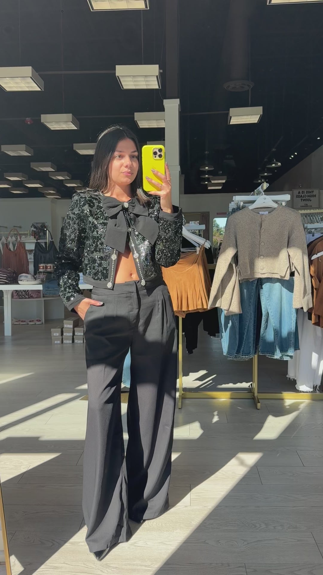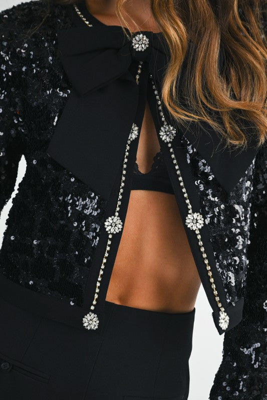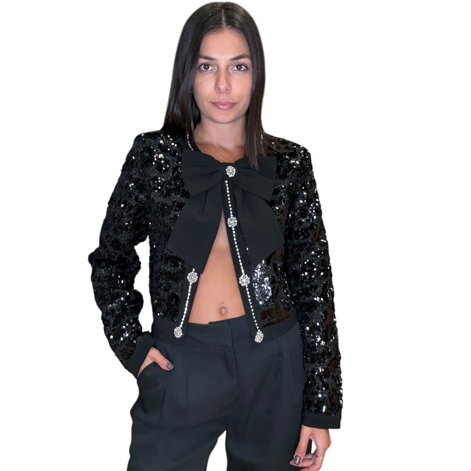 When cozy just won’t cut it, bring the sparkle ✨ This sequin tweed crop jacket stuns with a statement bow trim, rhinestone button closure, and luxe lining for a perfect fit. The cropped cut makes it perfect for pairing with high-waisted trousers, skirts, or over a slip dress for instant glam.