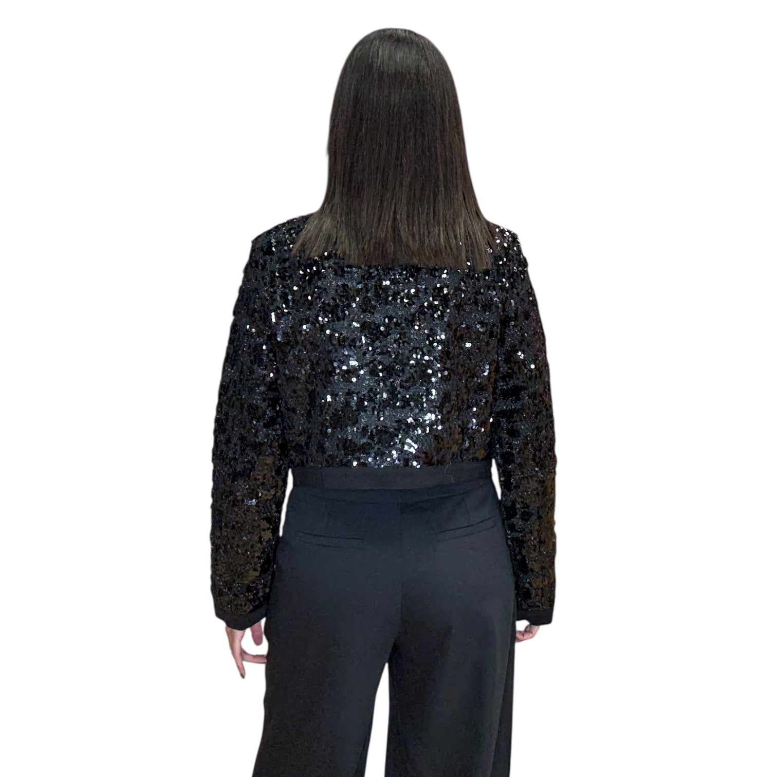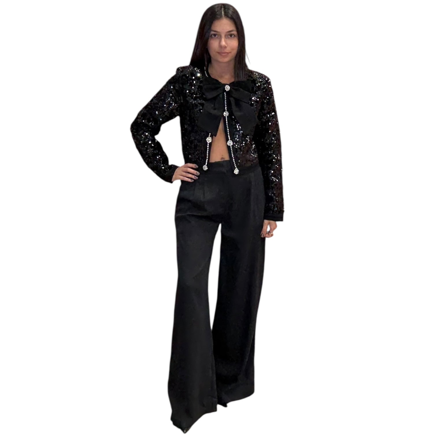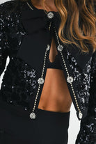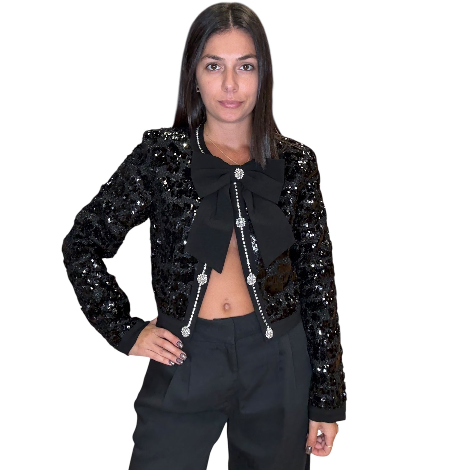 When cozy just won’t cut it, bring the sparkle ✨ This sequin tweed crop jacket stuns with a statement bow trim, rhinestone button closure, and luxe lining for a perfect fit. The cropped cut makes it perfect for pairing with high-waisted trousers, skirts, or over a slip dress for instant glam.