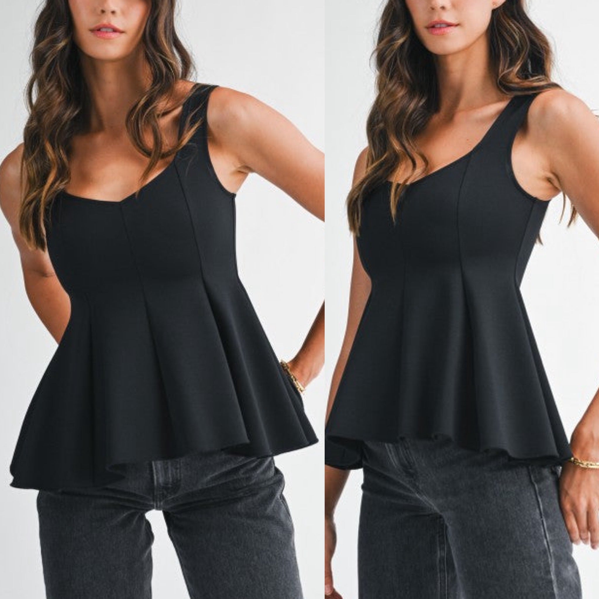 Flirty + structured = perfection 💫 The Sleeveless Peplum Top features a sweetheart neckline, wide straps, and a softly flared peplum hem that shapes your waist like magic. Fully lined with a smooth finish, it’s that classic black top you can wear a hundred ways.